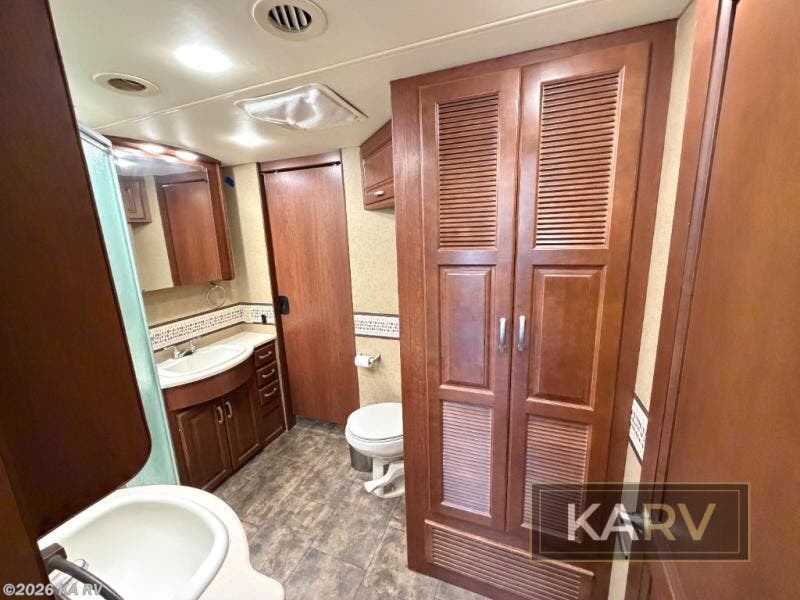 Heading toward the rear of this Challenger 37GT you will walk-thru a complete bath with angled shower, toilet, sink with overhead cabinet, full length mirror, and closet with stackable washer and dryer prep.