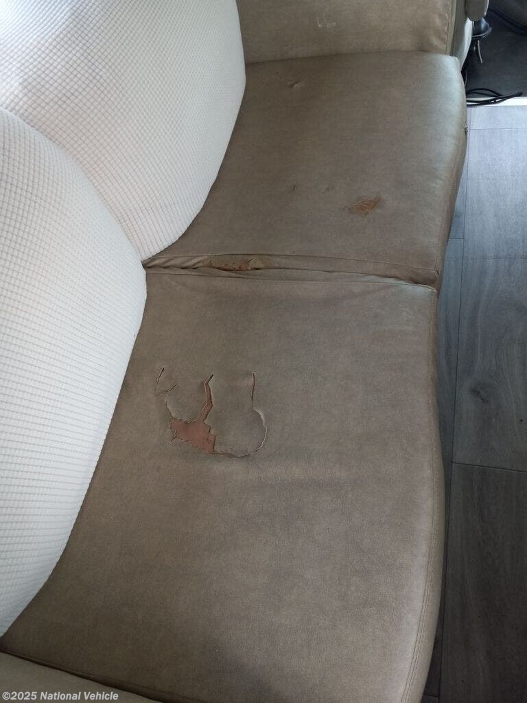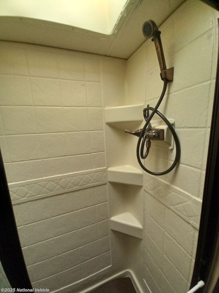 The private rear bedroom offers a walk-around queen bed, dual nightstands, wardrobe storage, and overhead cabinets. A split bath design includes a roomy shower on one side and a private toilet and vanity on the other, ensuring convenience and privacy. Additional features include a power awning, Onan generator, ample basement storage, and a rearview camera system.