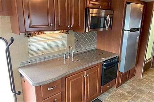 There is a full kitchen mid-coach with the main bedroom and bath to the rear of the coach.