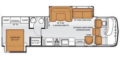 The coach features a full drop-down cab over the bed and the convertible dinette and sofa, providing plenty of room for family and friends.