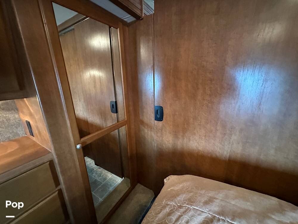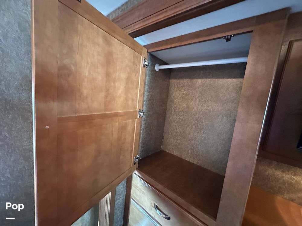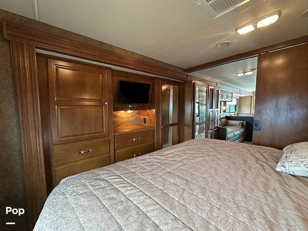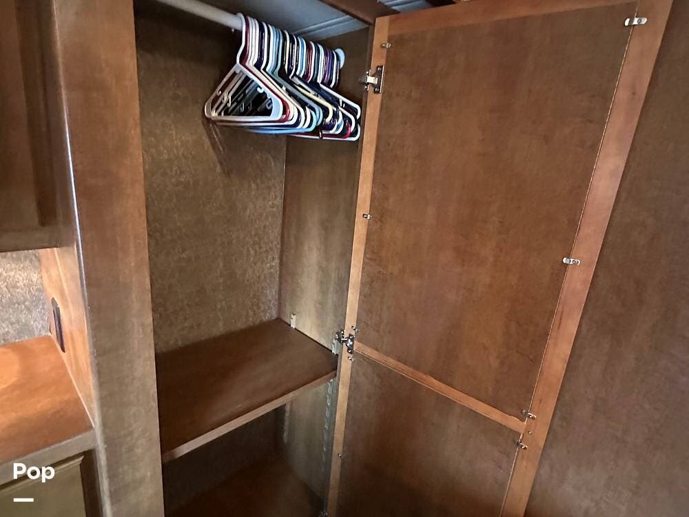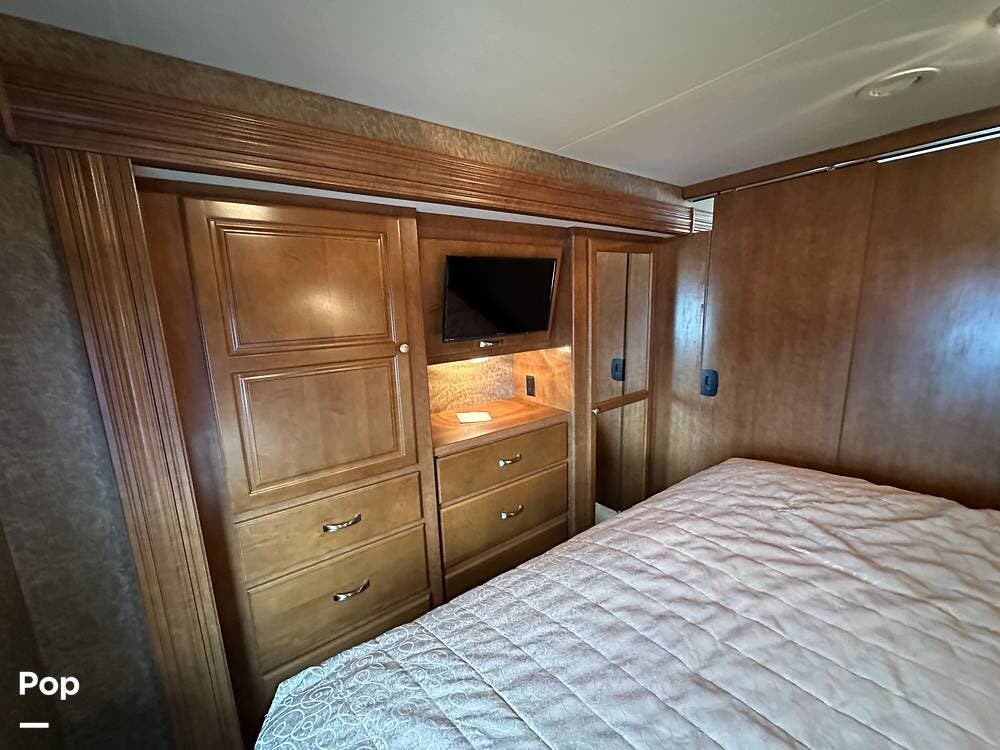 The rear master suite features a comfortable king bed with storage below. Also tons of maple wood cabinet and drawer space, and a large closet with sliding mirrored doors. 24" wall-mounted TV.