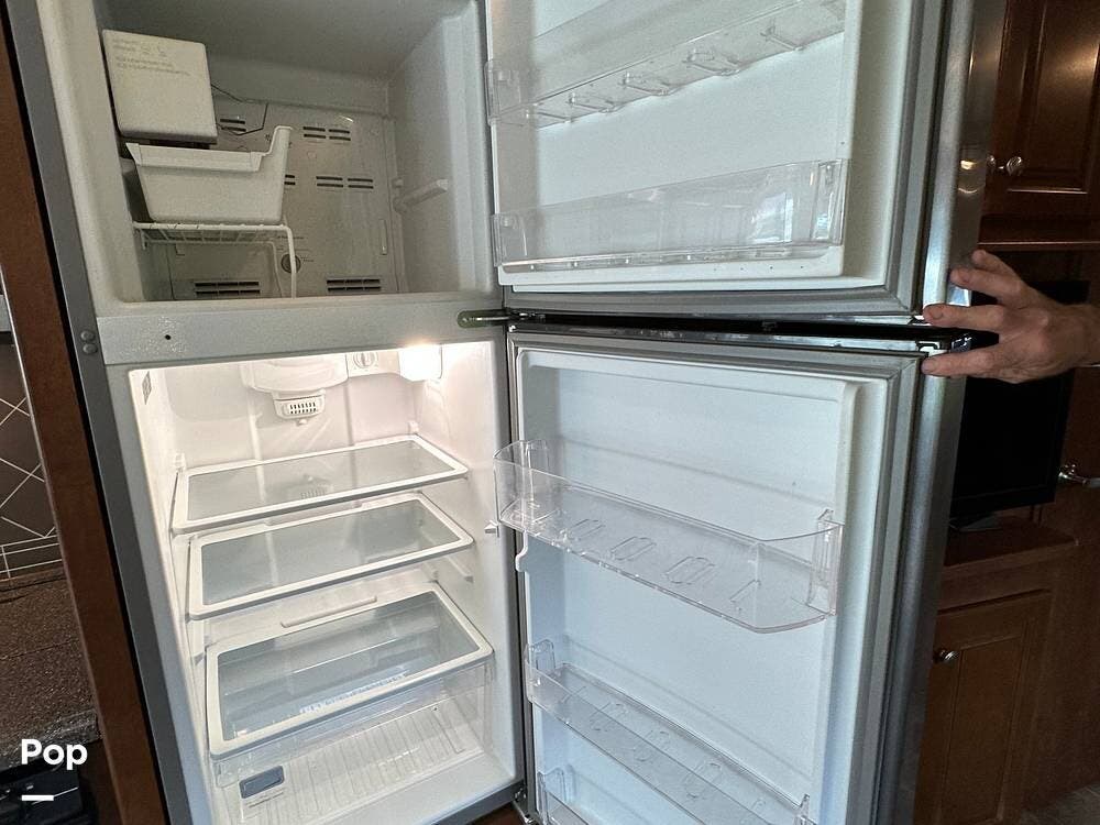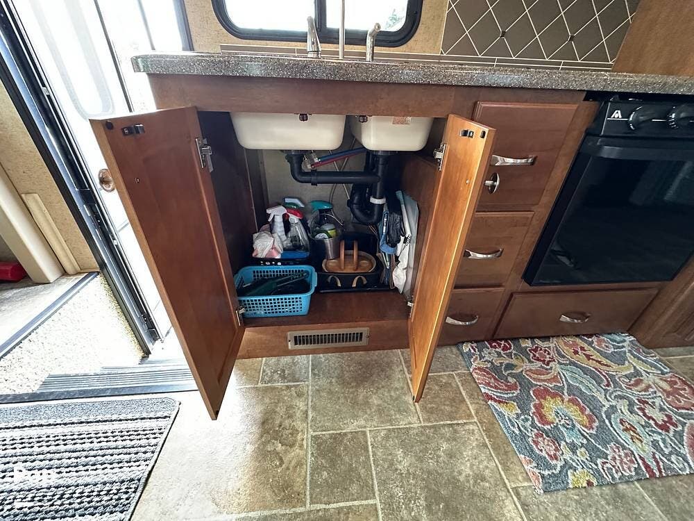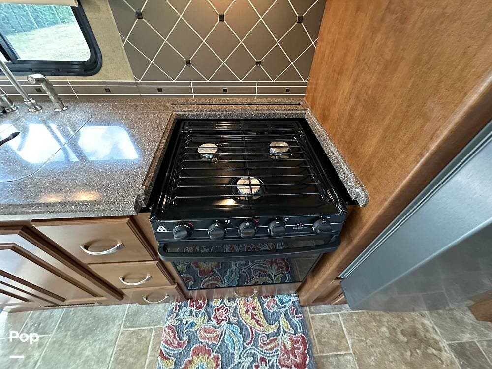 Inside, you will find a spacious kitchen with solid-surface counters, a kitchen sink, a fridge/freezer, a microwave, and a 3-burner gas cooktop and oven. There are lots of maple wood cabinets, drawers, and pantry space.