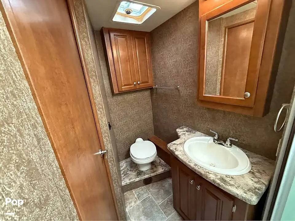 Moving to the rear, there is a flip-out sleeper sofa with an air mattress. Both with in view of a wall mounted 32" TV. Moving down the hall is a bathroom with a large shower, ceramic toilet, maple wood vanity with sink and medicine chest, and a wall-mounted storage cabinet. Just across from the bathroom, there is a louvered linen closet pre-prepped for a washer/dryer combo and a mirrored hanging locker to the left.