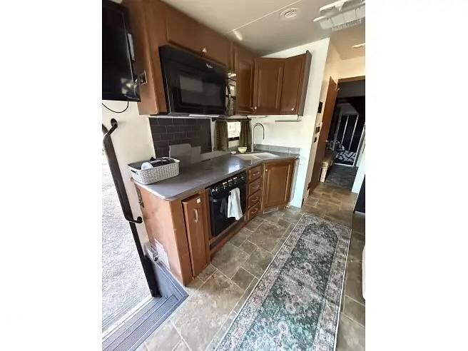 The kitchen is well-appointed with a full-sized refrigerator and microwave oven/stove.