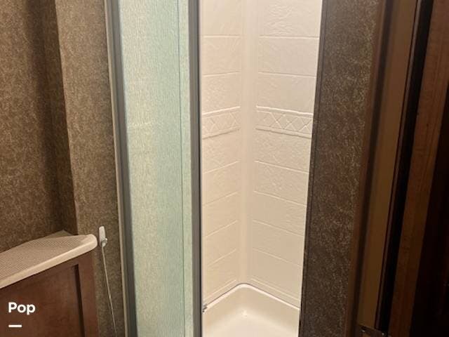 Toward the rear, the bathroom features a corner shower, toilet, and a separate vanity with sink. The master suite features a queen bed with wardrobes on either side and overhead storage.