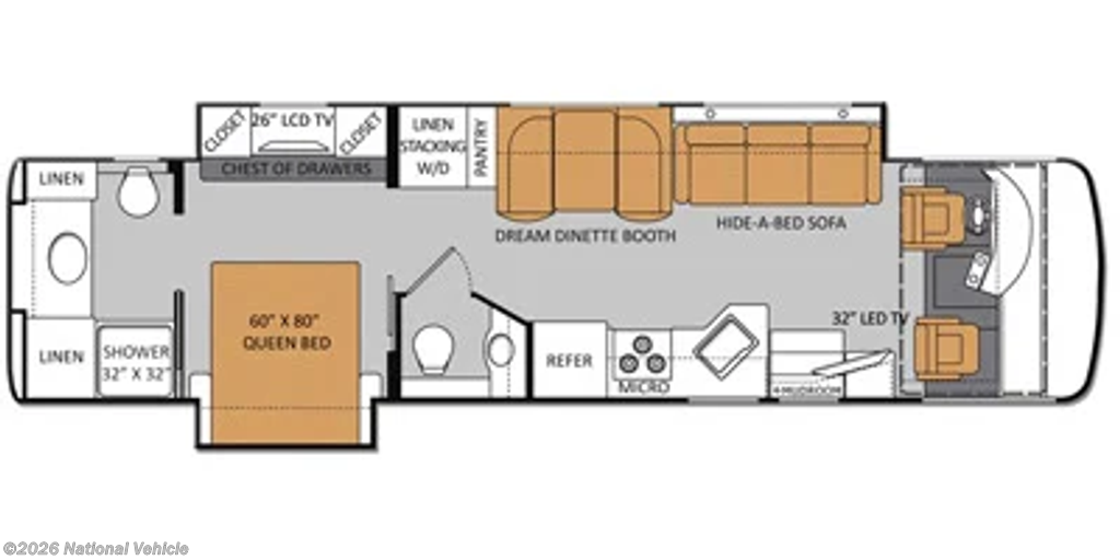 Toward the rear, the master suite provides a private retreat with a comfortable bed, generous wardrobe storage, and washer/dryer prep for extended travel convenience. The spacious bathroom includes a large shower, vanity, and high-end finishes that elevate the everyday experience.