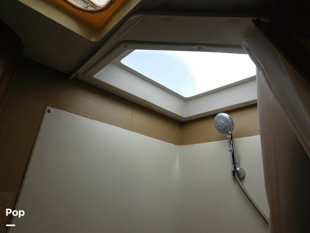 The bedroom in the Siesta 24SR is cozy and inviting, with a comfortable queen bed and plenty of storage space for your belongings. The folding door provides privacy for bed/bath. The forward overhead loft is good sized for another comfy sleeoing area. RV has privacy cover for cab glass - pictured.