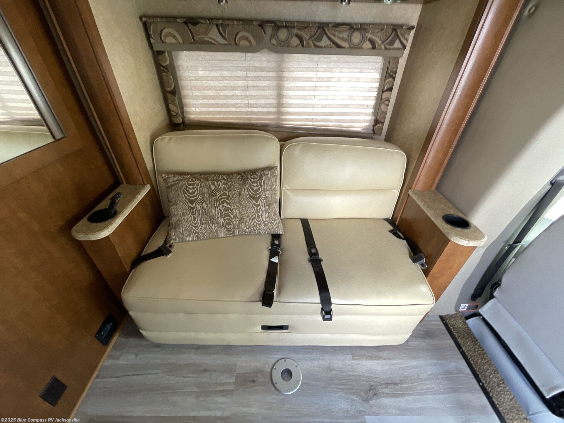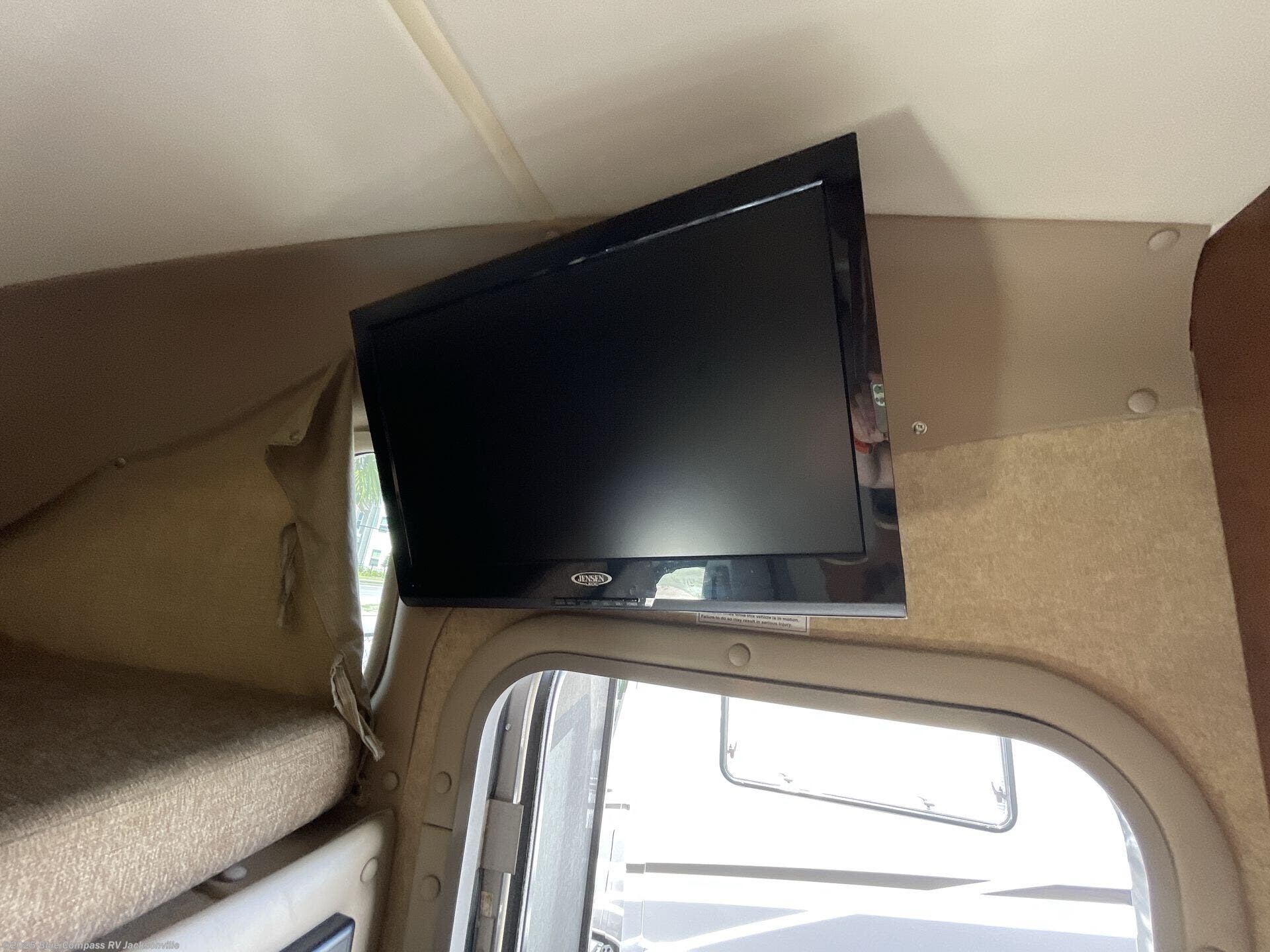 There is a 22" TV mounted above the door which can easily be viewed by the slide-out hide-a-bed sofa across the unit. The sofa features overhead storage, cup holders on the arms, and a pedestal table that is perfect for meal time.