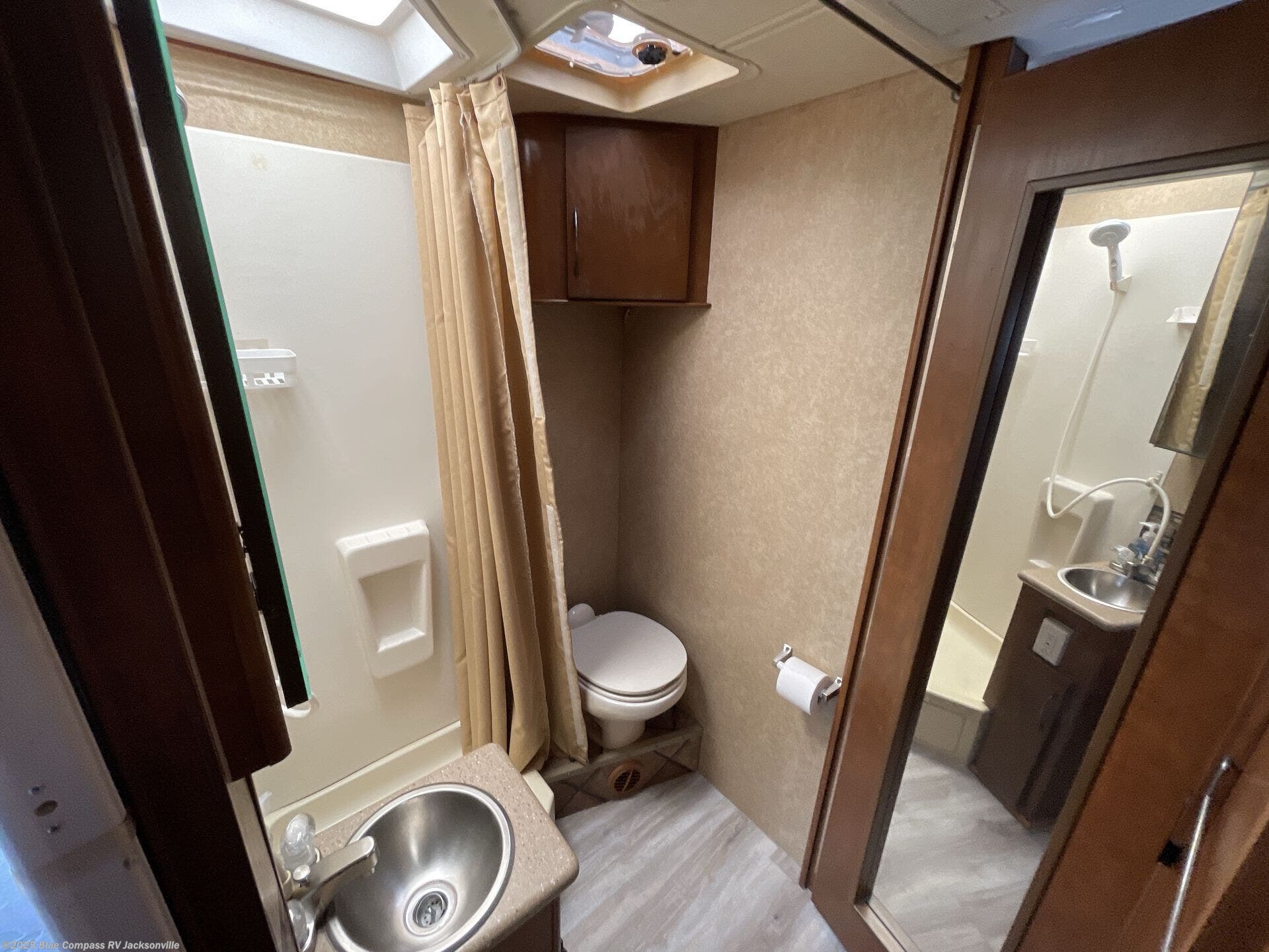 Moving toward the back of the coach you will find a bath on your right including an angled shower, toilet and sink. There is a storage closet across the hall for your things.