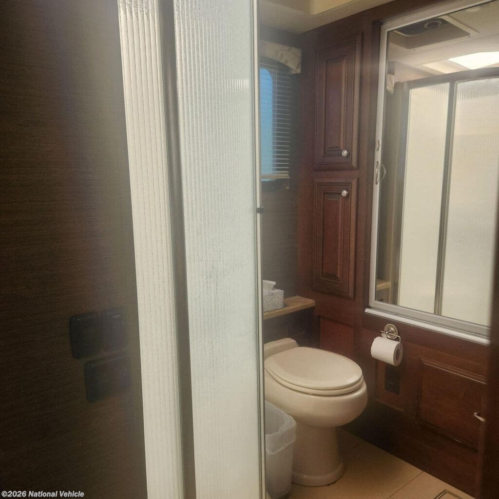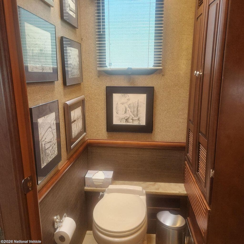 This coach features a bathroom complete with shower, toilet, and a sink with a medicine cabinet above for your convenience.