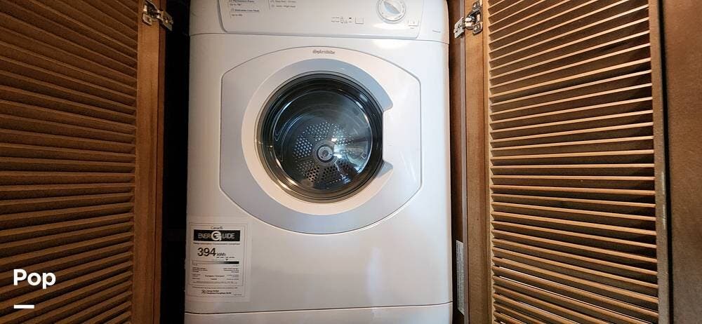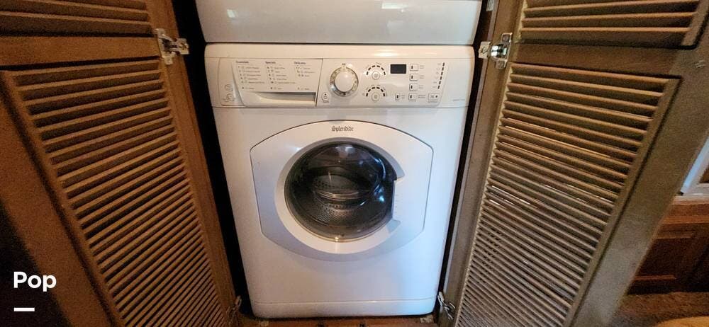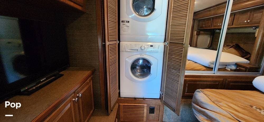 At the rear, the private bedroom offers a king-size bed, generous storage, and a 32" TV. The full bathroom features a spacious shower and a porcelain toilet for added convenience. A stackable washer/dryer and outdoor TV make this coach ready for any journey.