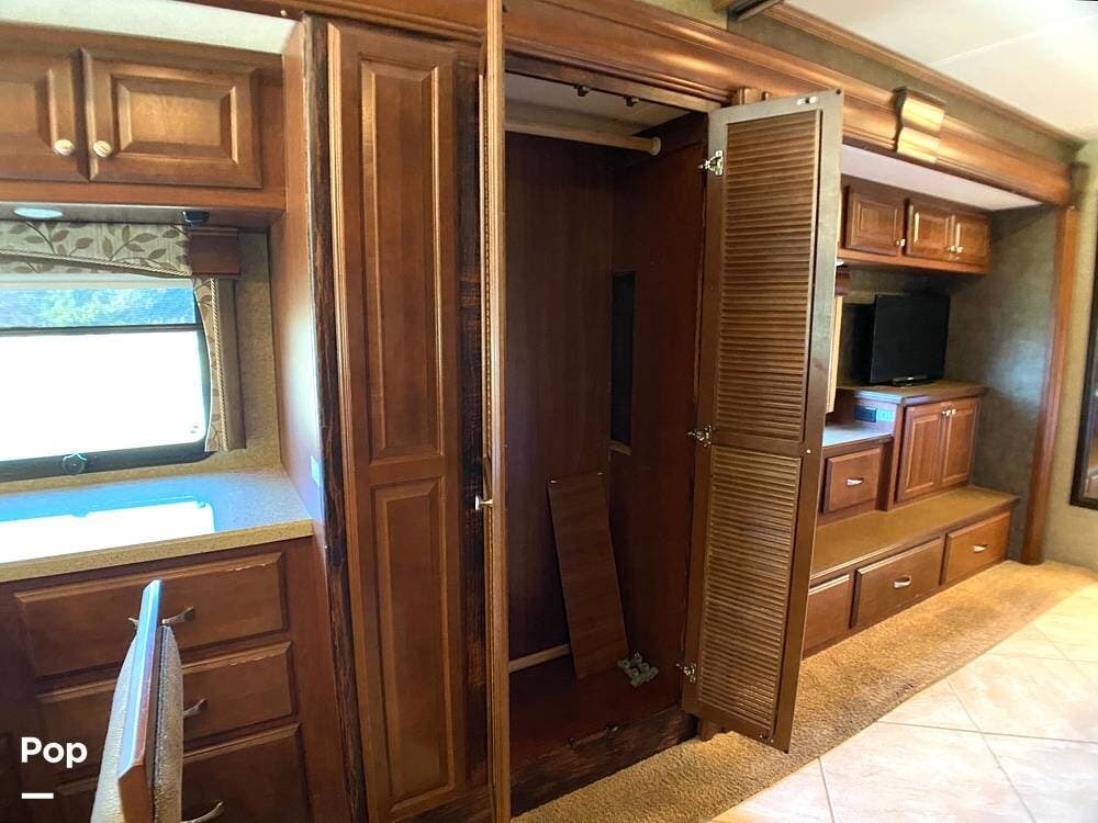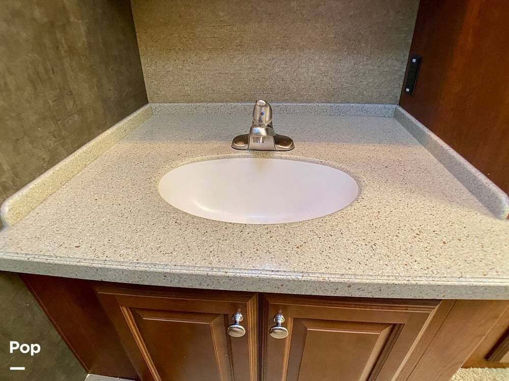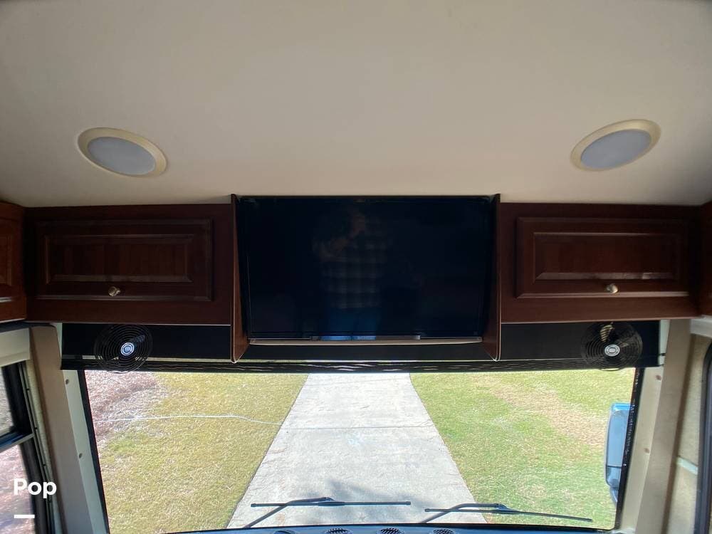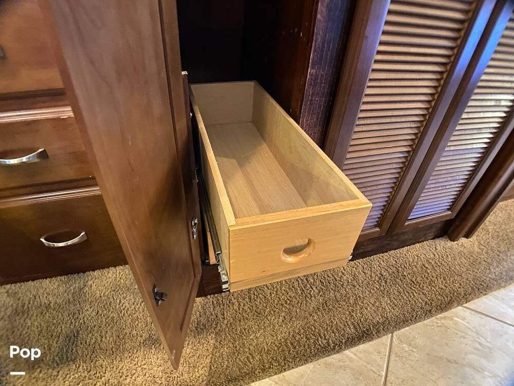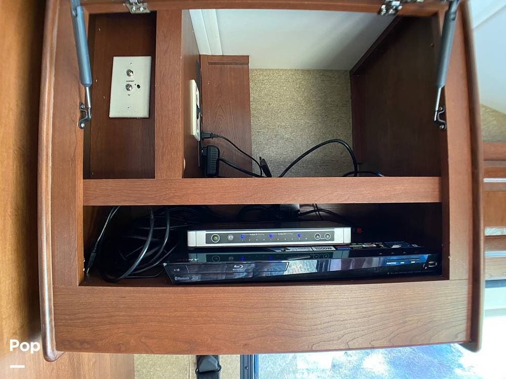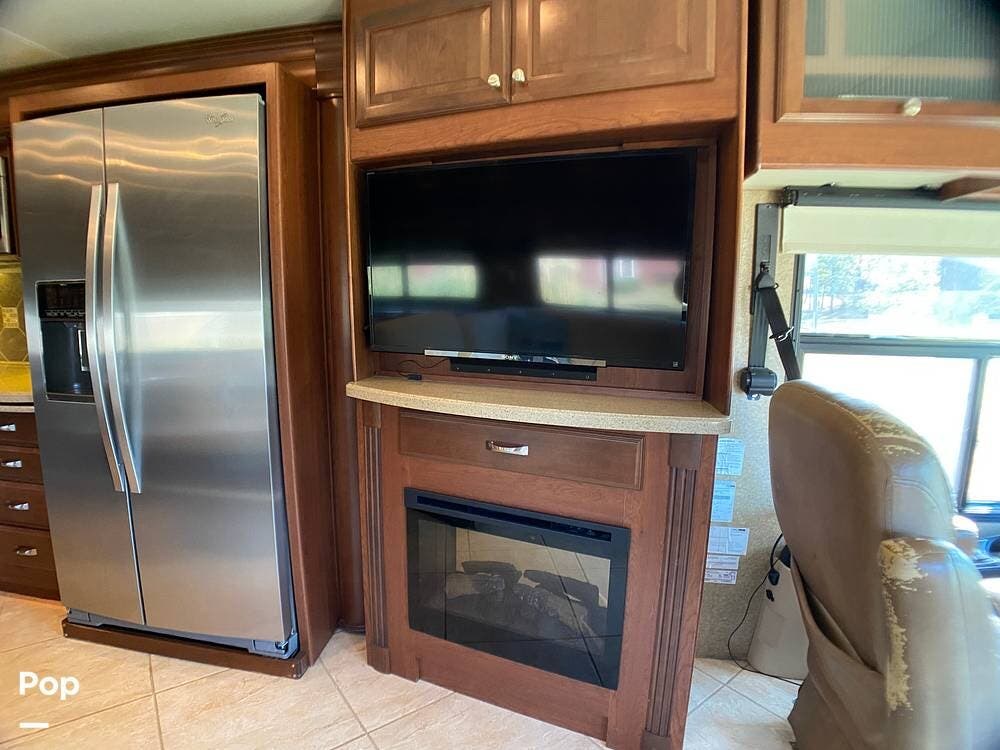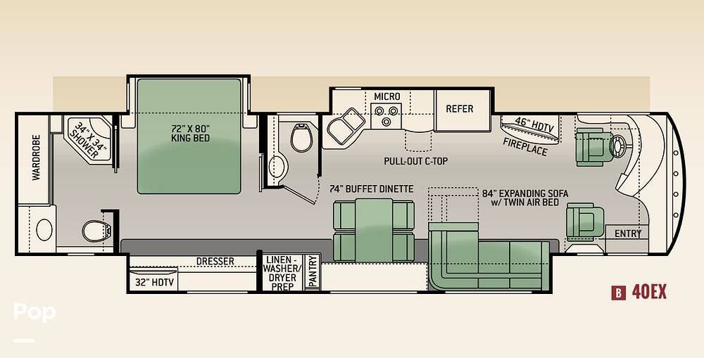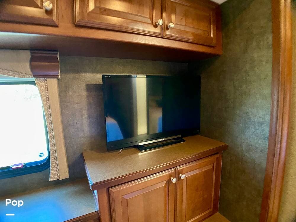 The main living area has an expanding sofa with a twin air bed that faces an entertainment center with a 46" HDTV over a fireplace. There is a second TV in this area above the windshield where you will also find plenty of cabinet storage.