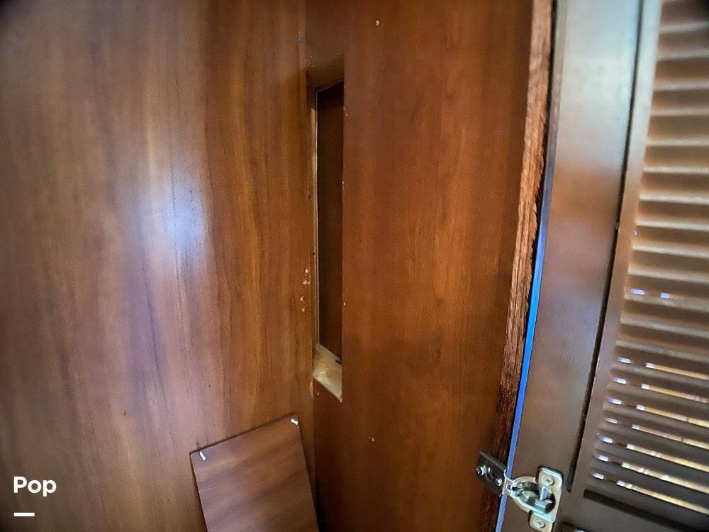 There is a half-bath between the main living area and the master bedroom, and across the hall a closet that is prepped for a clothes washer and dryer. The bedroom has a king-size bed, cabinet storage, and a 32" TV.