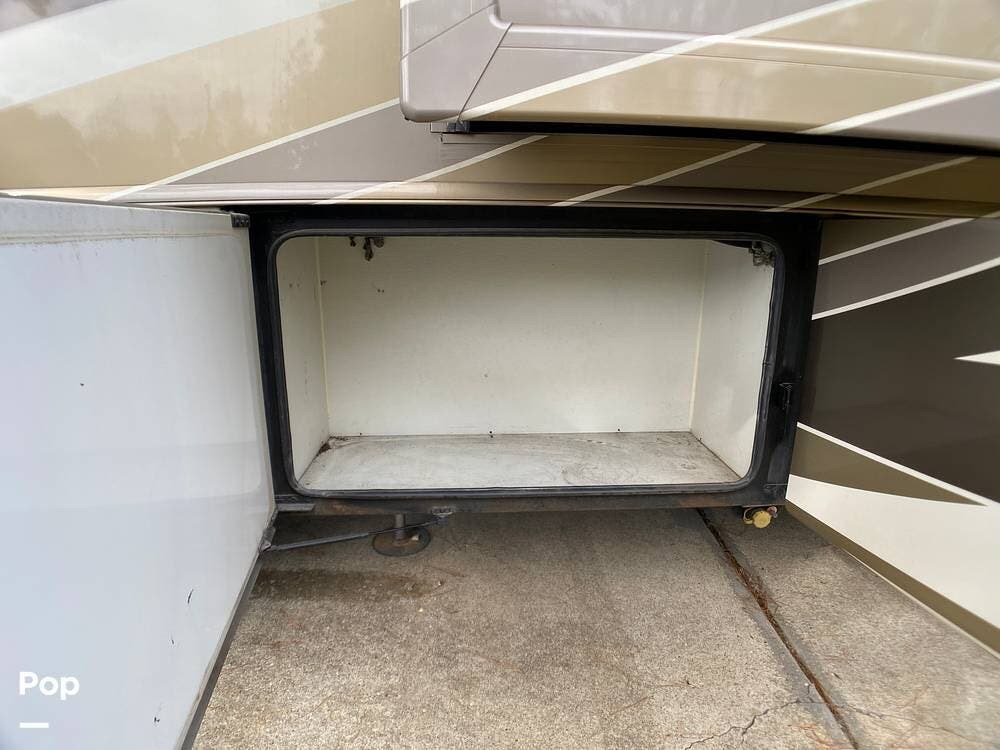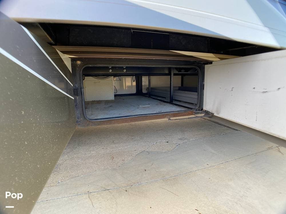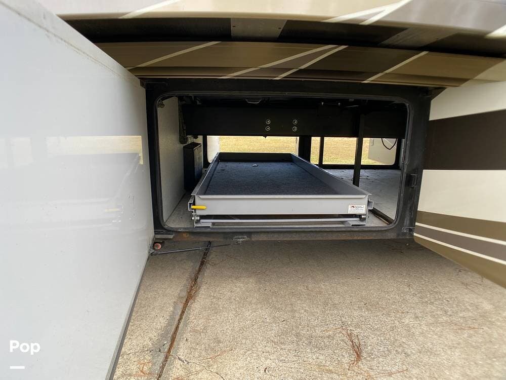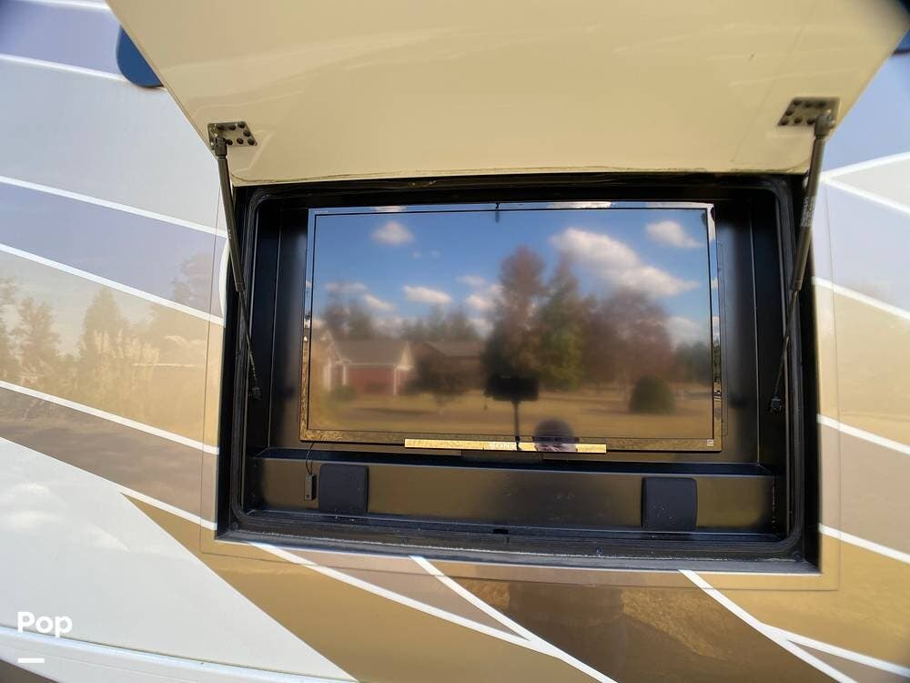 On the exterior, there is a slide-thru storage tray as part of 215 cubic feet of total storage capacity. There is an exterior TV for outdoor entertainment under the 16-foot patio awning. There is also an awning over the coach entrance door.