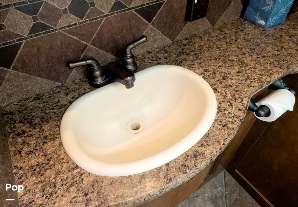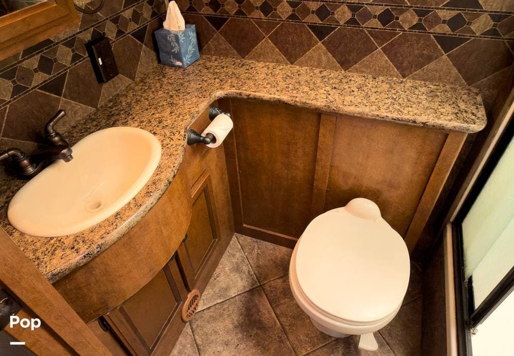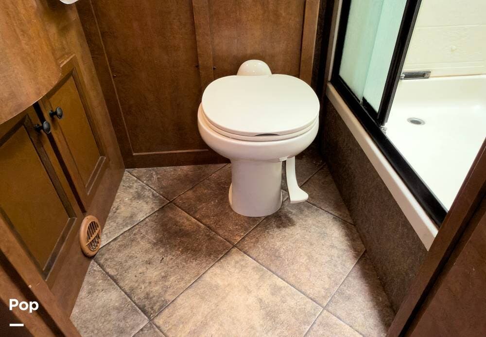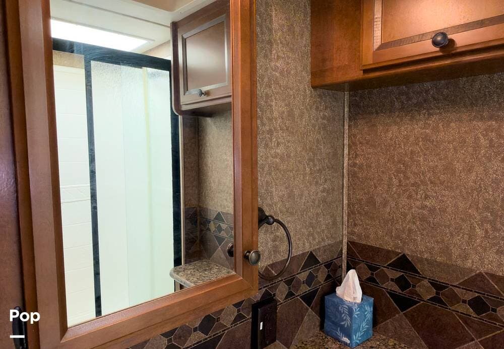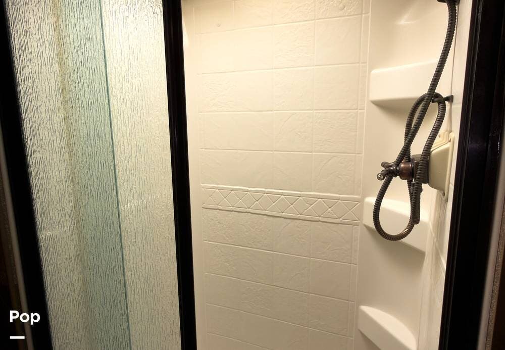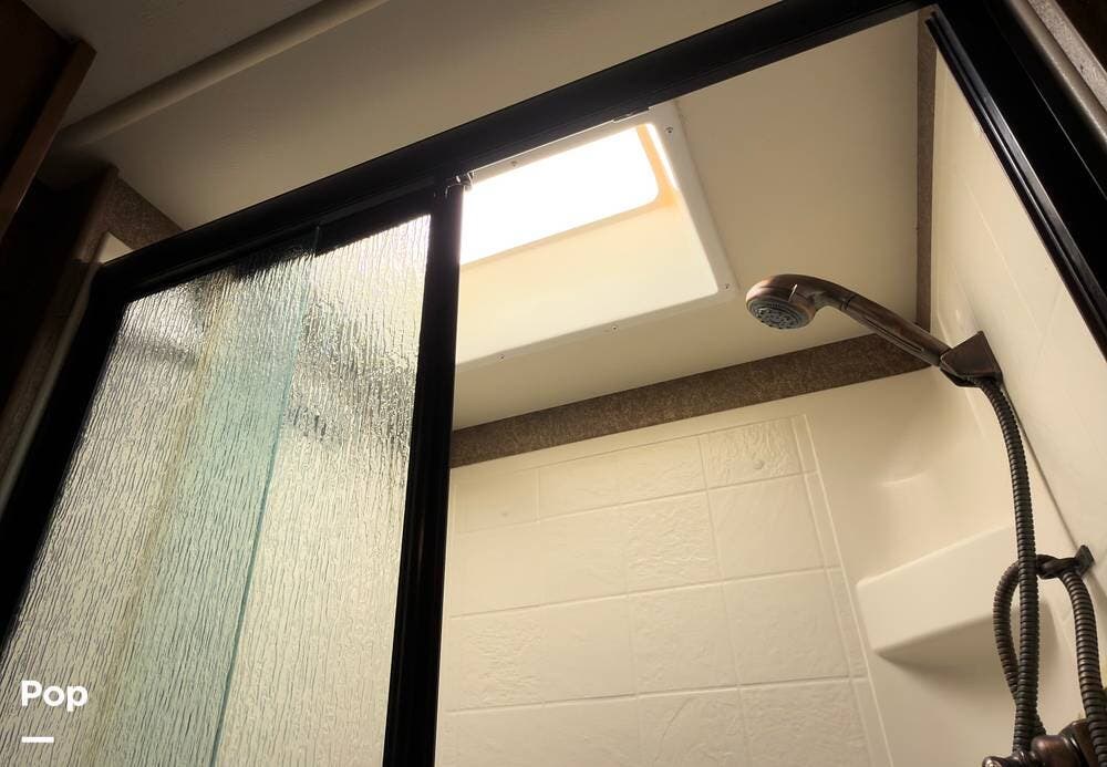 The bathroom is fully equipped with a shower, vanity, and toilet. Tons of storage inside and out, lots of cubic feet of exterior storage to boot.