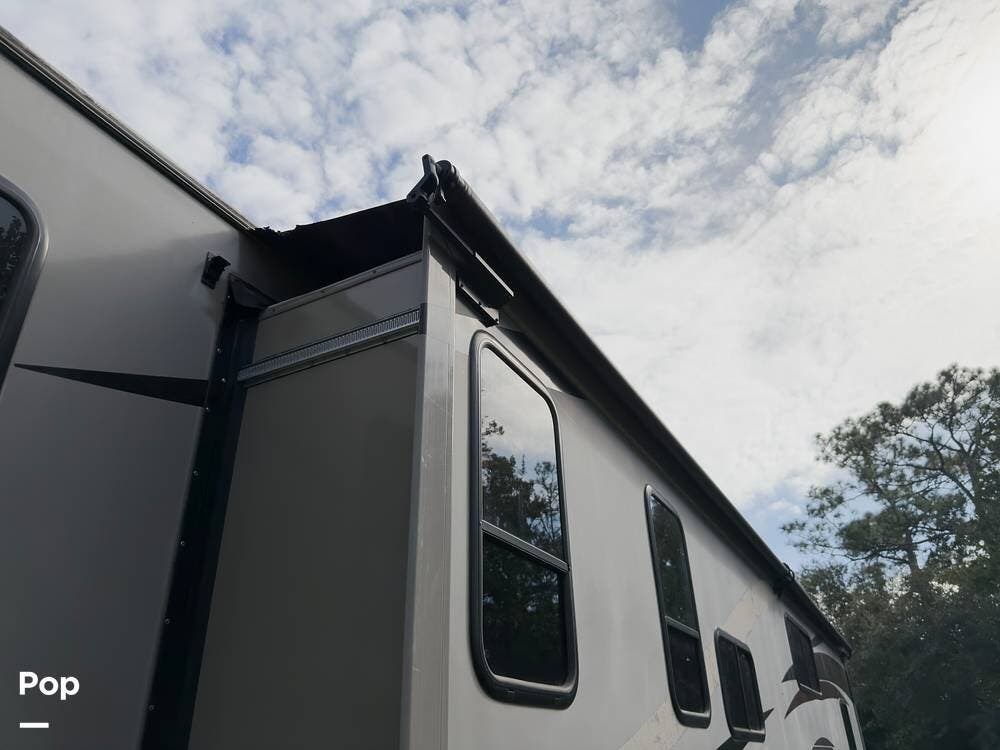 Outside, you've got a mini kitchen with sink and fridge, a spot for a TV, a big power awning, and an Onan 5.5kW generator. Everything works as it should, and it's ready for the road.