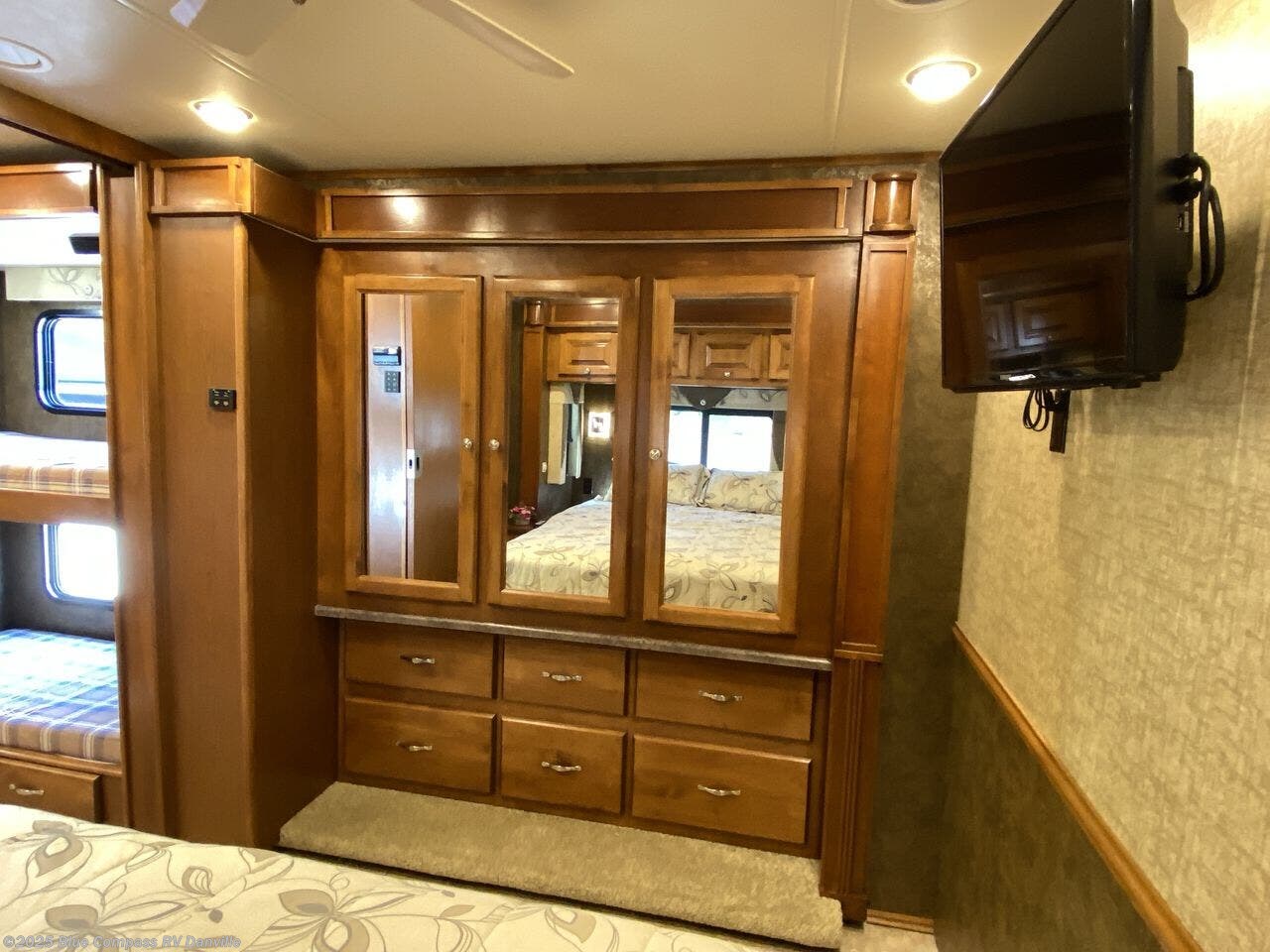 A rear bedroom includes a queen bed slide out with nightstands at each side of the bed and overhead cabinets above. A TV is mounted in the corner with the wall opposite the bed. Across from the bed you will find a slide with a wardrobe, drawers, and bunk beds.