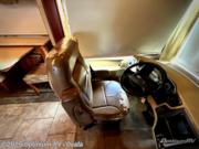 The road side offers a large slide housing a booth dinette, a chaise sofa bed with a coffee table, a lounge chair with an ottoman and overhead cabinets. You may choose an optional dinette with computer workstation.