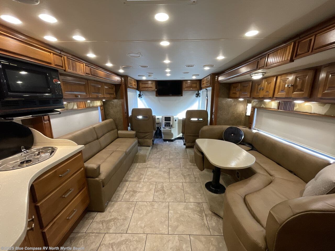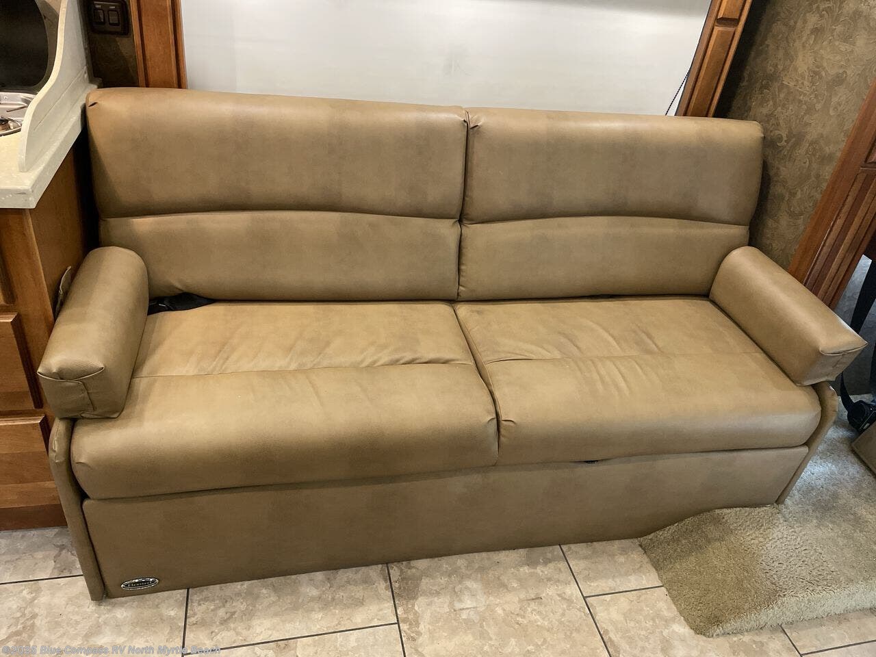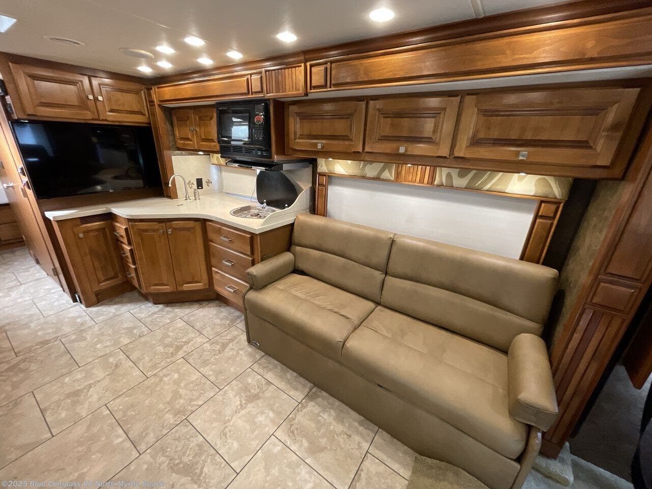 The road side features a slide housing a sofa bed, two burner range top, overhead microwave, corner angled double sink and lots of overhead cabinets. A TV is on an inside wall near the sink, and it faces the front of the coach.