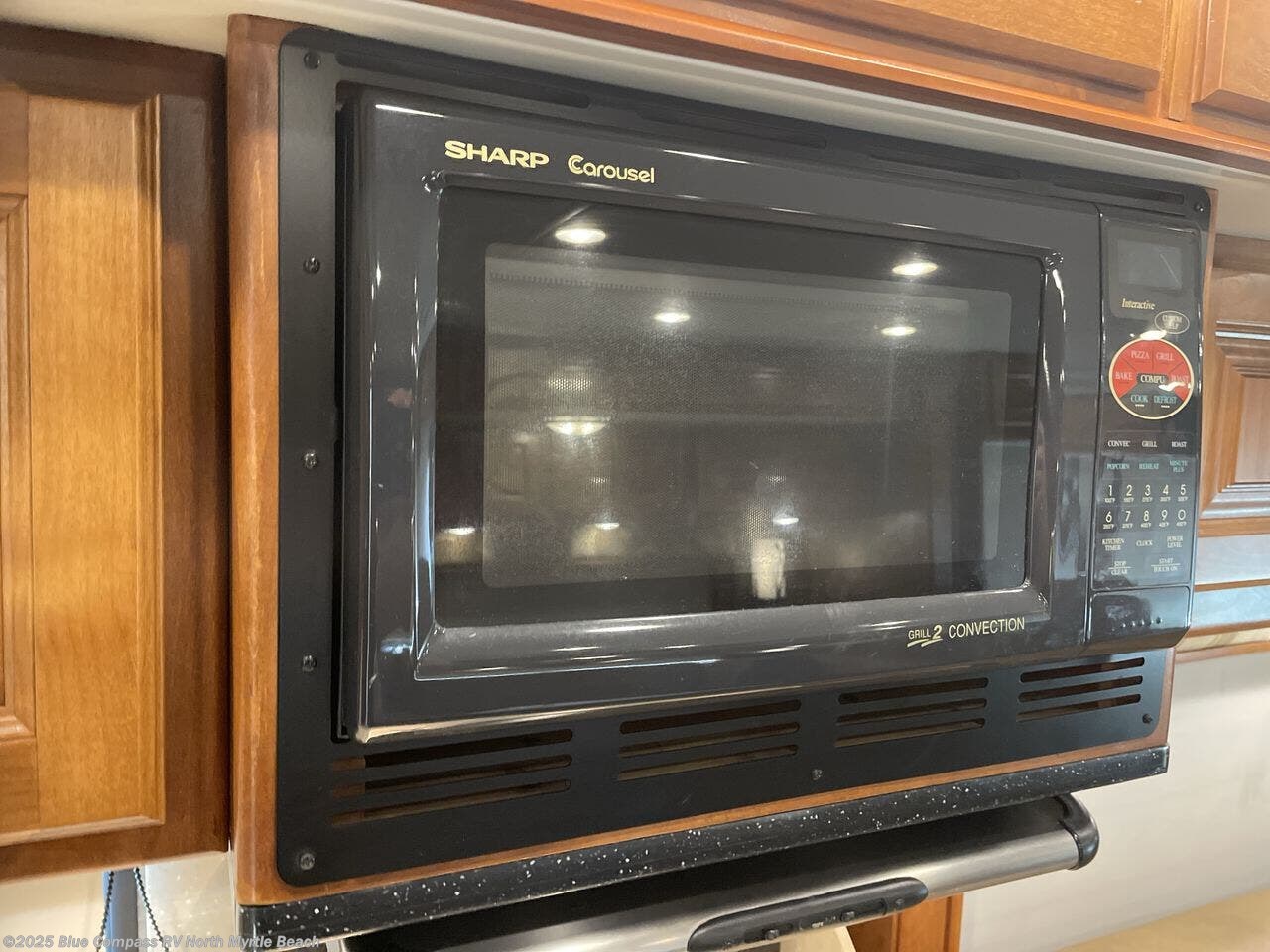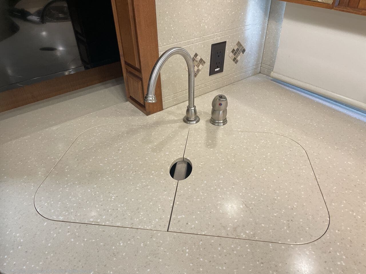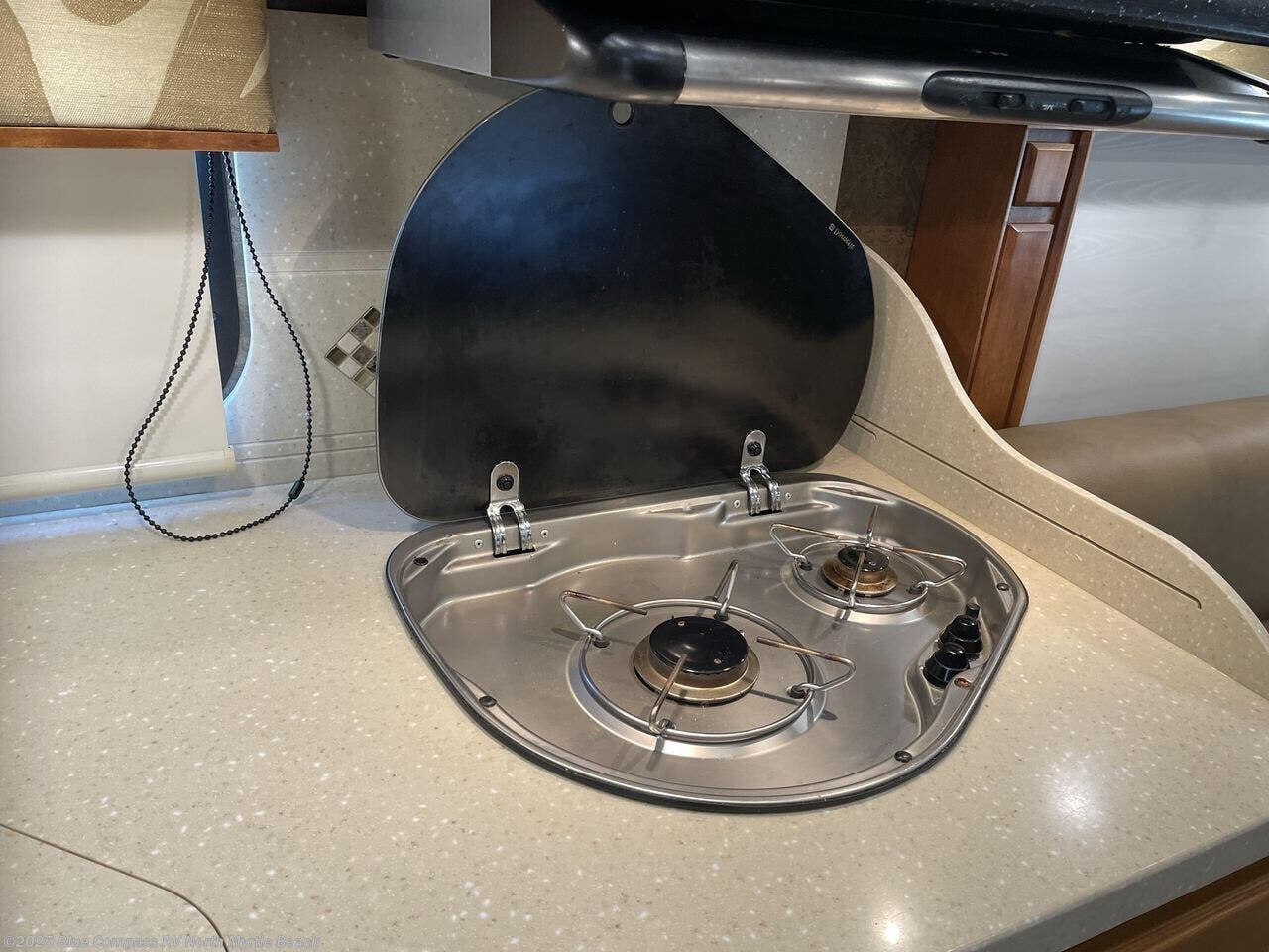 The road side features a slide housing a sofa bed, two burner range top, overhead microwave, corner angled double sink and lots of overhead cabinets. A TV is on an inside wall near the sink, and it faces the front of the coach.