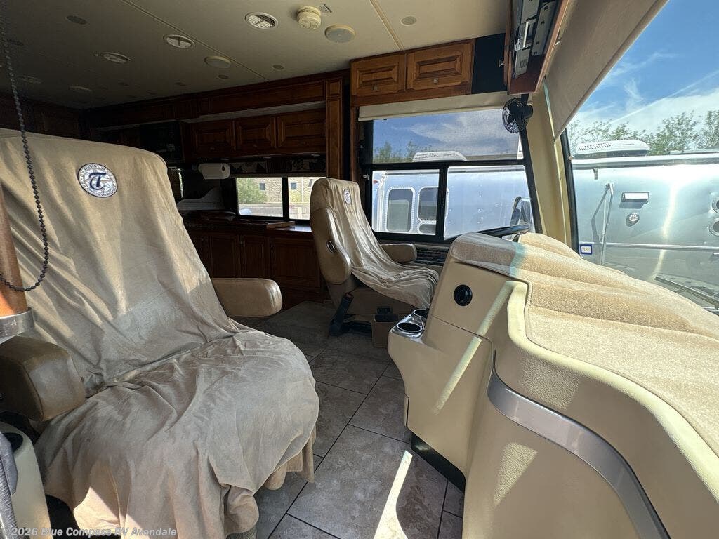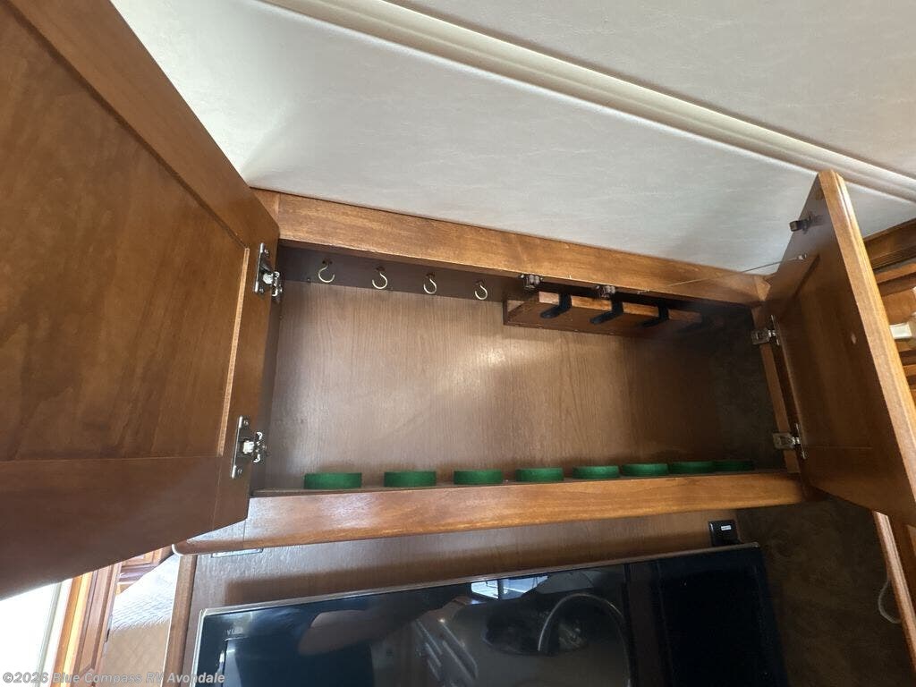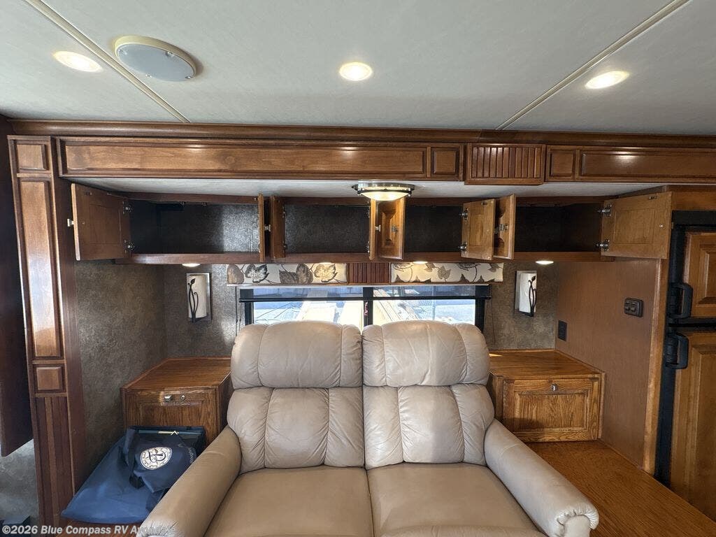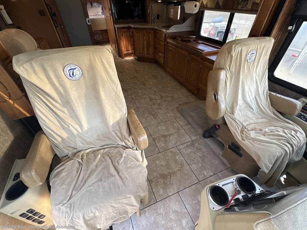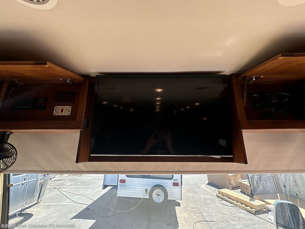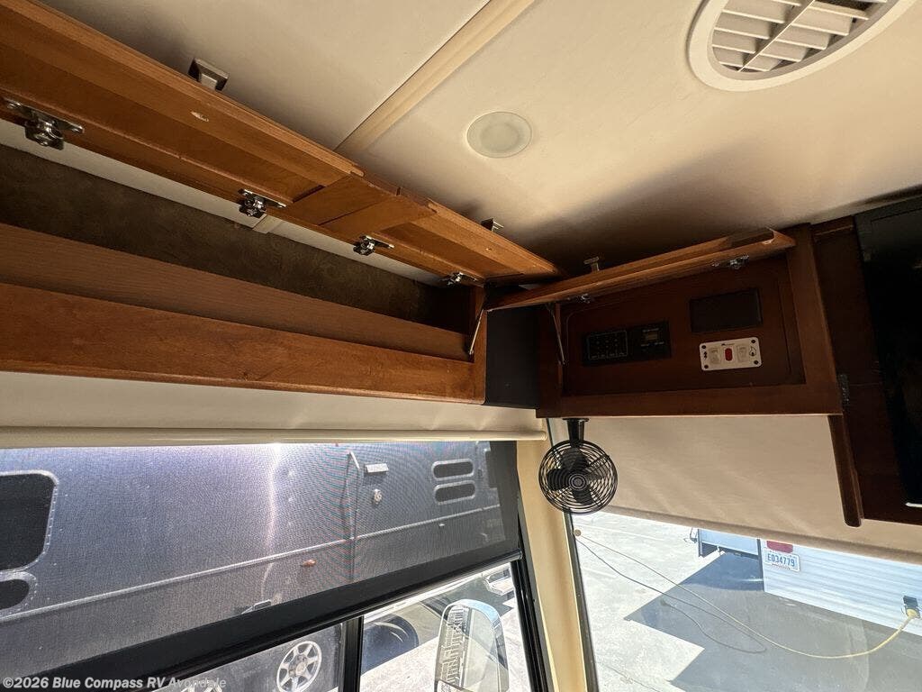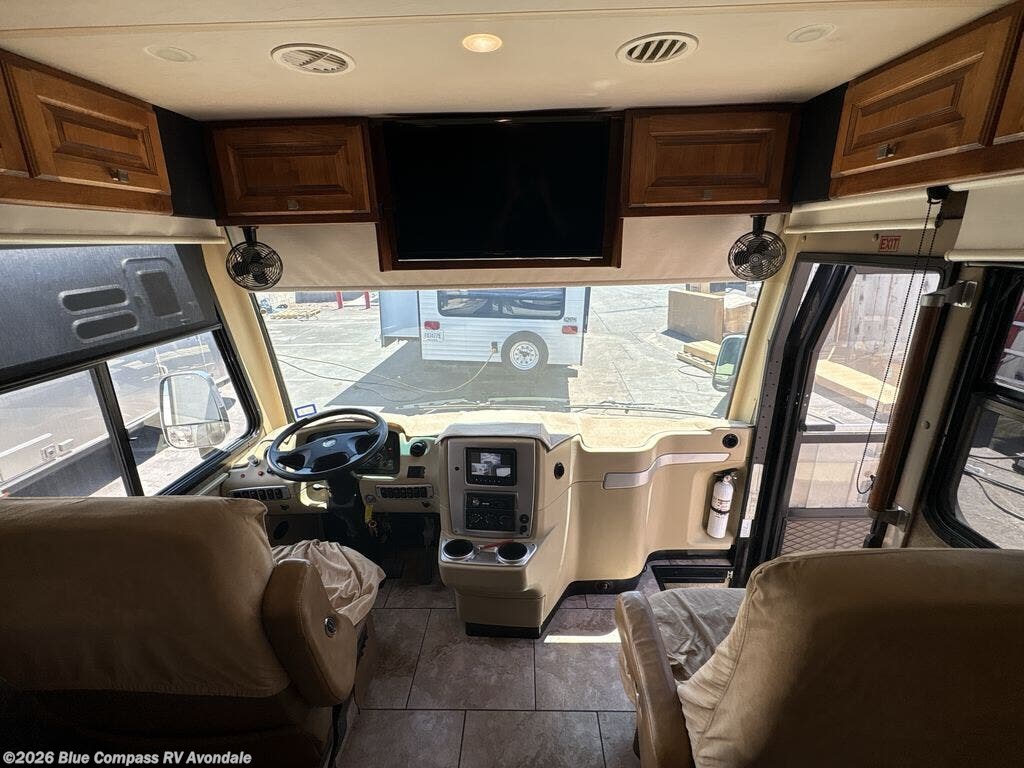 Step into the front entry to find two captains chairs, overhead cabinets, and an optional TV at the center front.