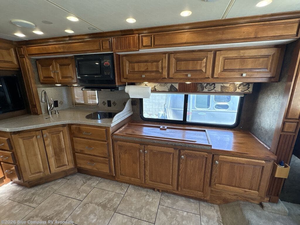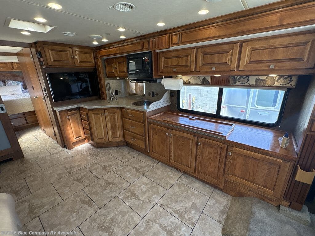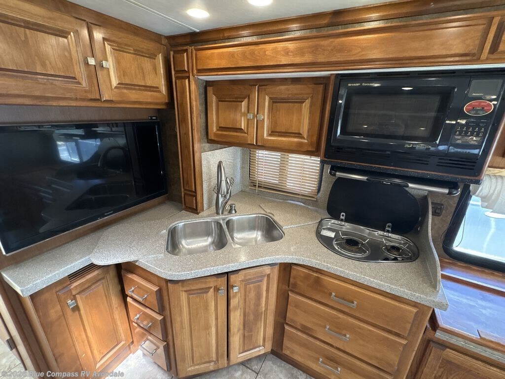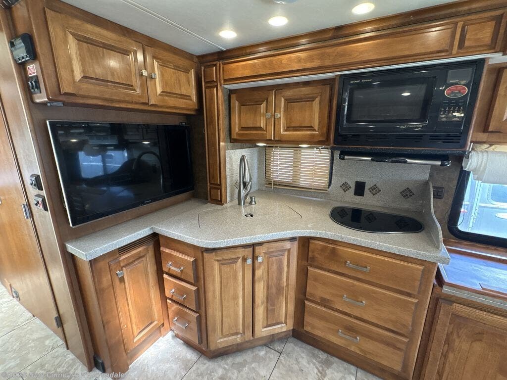 The road side features a slide housing a sofa bed, two burner range top, overhead microwave, corner angled double sink and lots of overhead cabinets. A TV is on an inside wall near the sink, and it faces the front of the coach.
