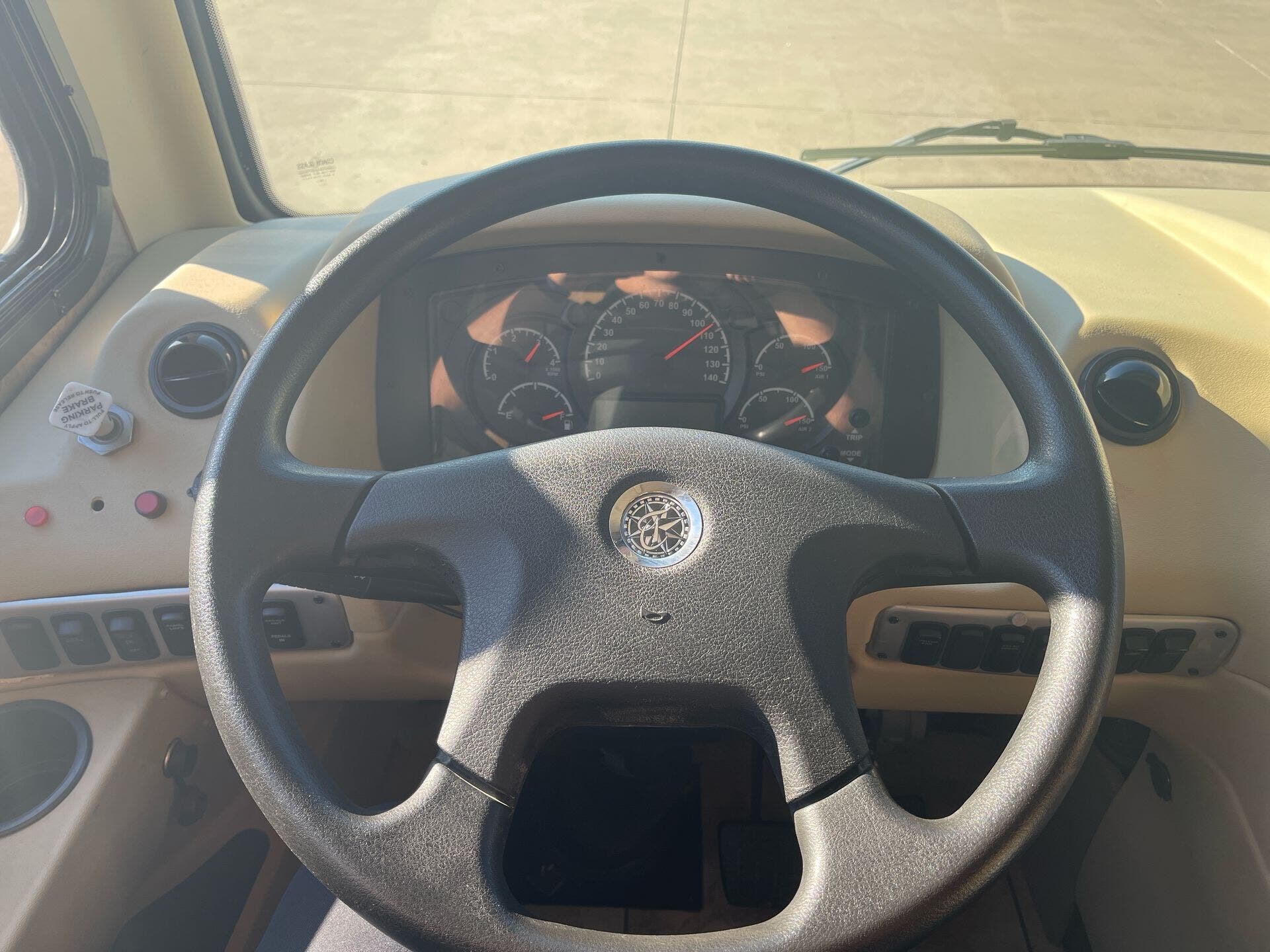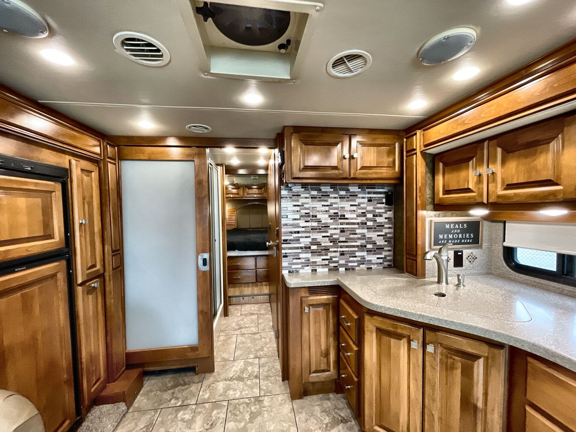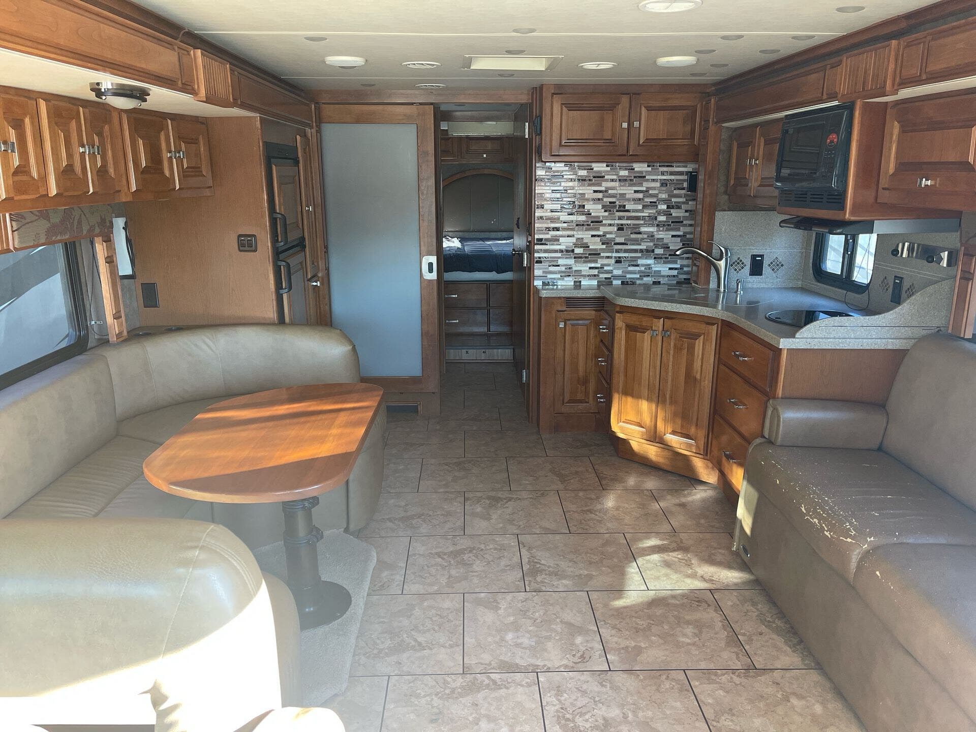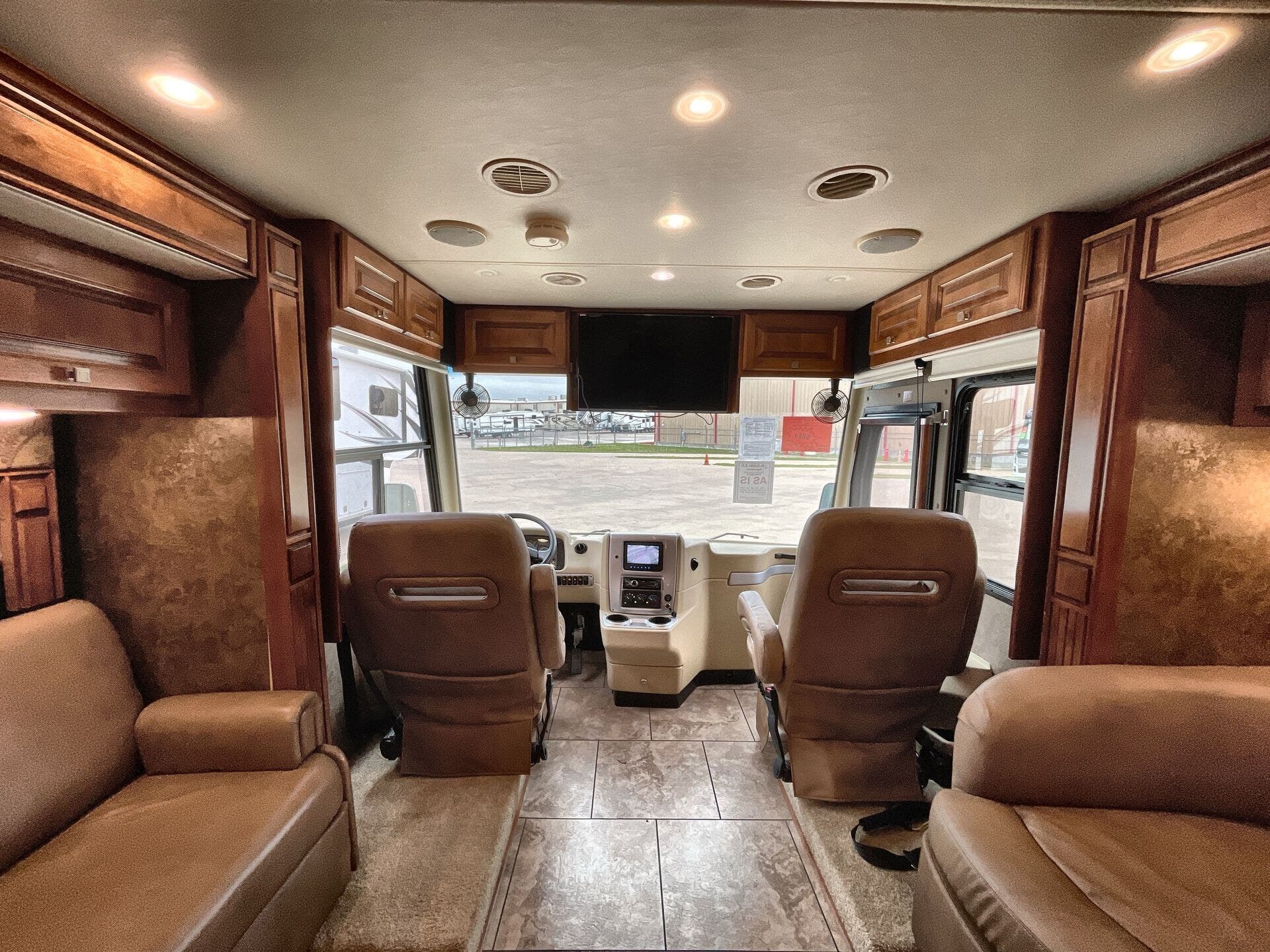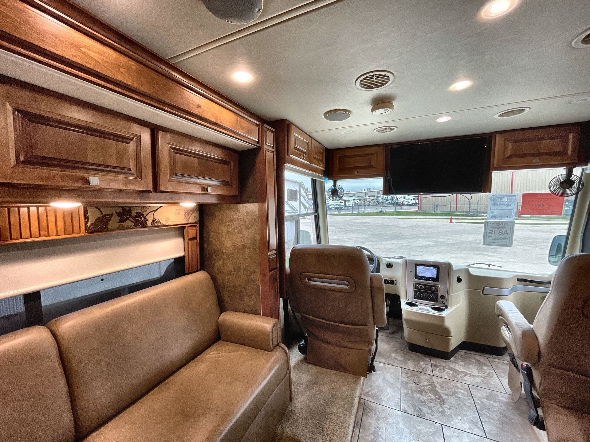 Powered by a Navistar MaxxForce 7 V8 diesel producing roughly 240 hp and strong torque, mated to a 6-speed Allison automatic transmission, this rig rides on a PowerGlide chassis. It has a GVWR of about 23,500 lbs and fresh water, gray, and black tank capacities of approximately 70, 50, and 30 gallons respectively.