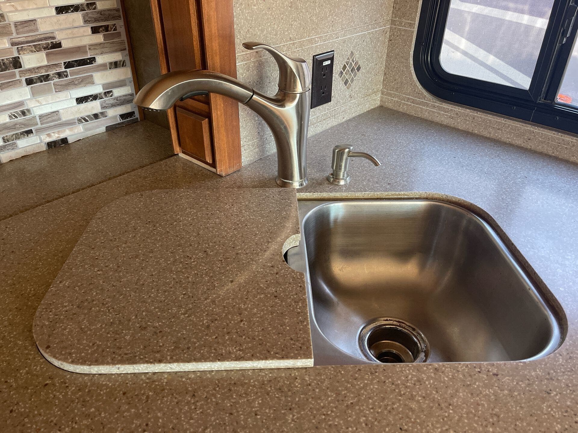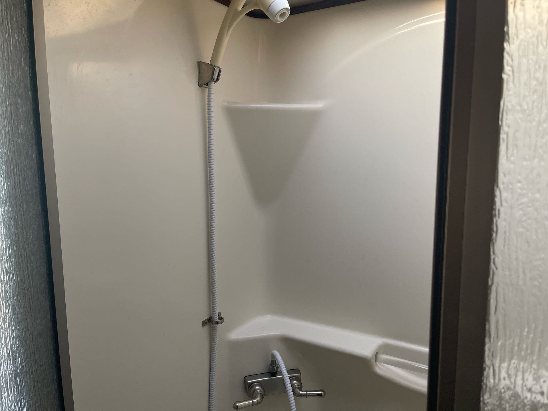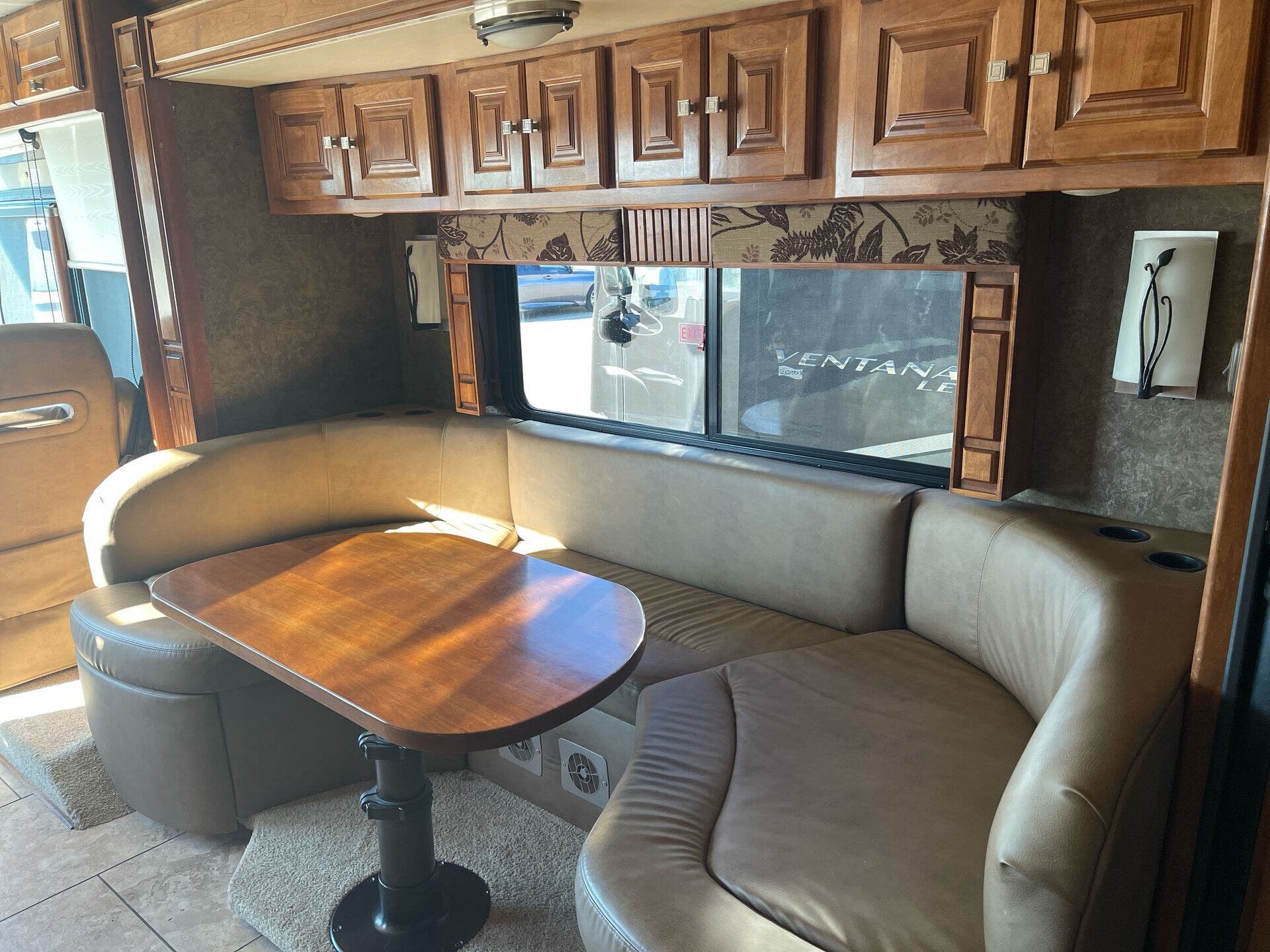 Inside, the coach sleeps between 5 and 6, depending on configuration. The floor plan features a rear queen bedroom with dual side wardrobes and storage, a split bath (toilet/vanity on one side, shower opposite), and an open living area up front. Opposing slide-outs accommodate a U-shaped dinette that converts to bed plus a sofa bed, and a well-equipped kitchen with a double-bowl sink, microwave, cooktop, refrigerator, and pantry.