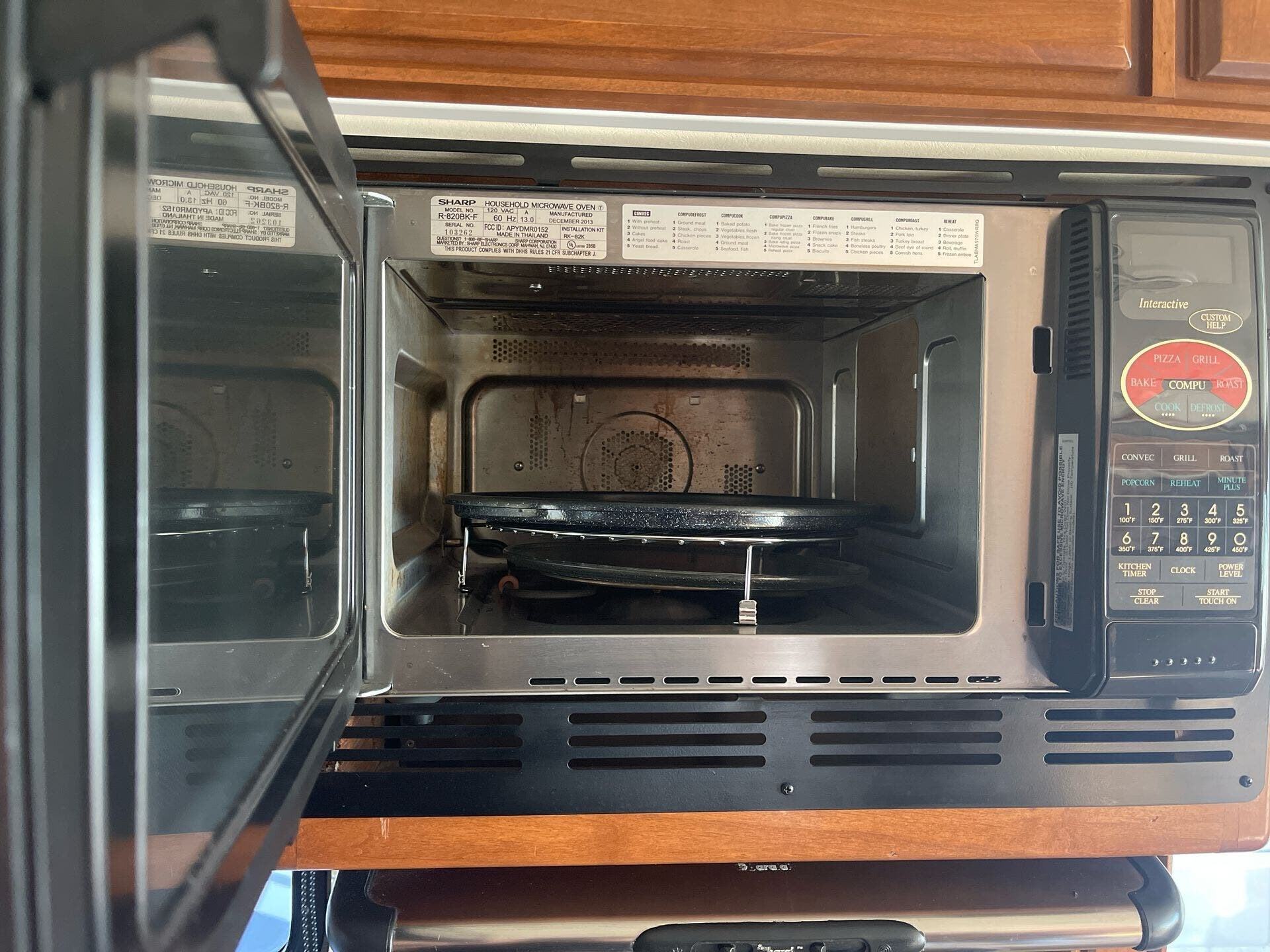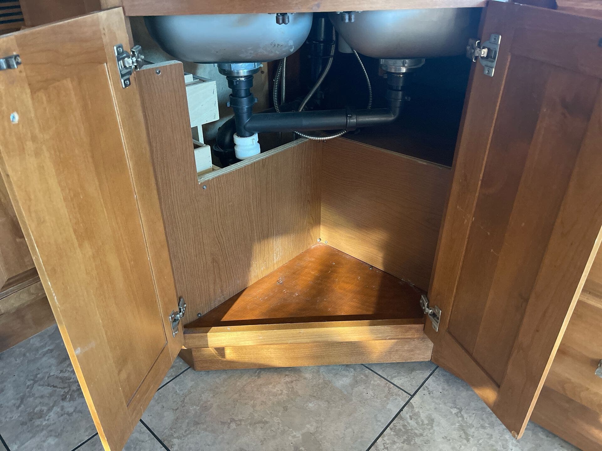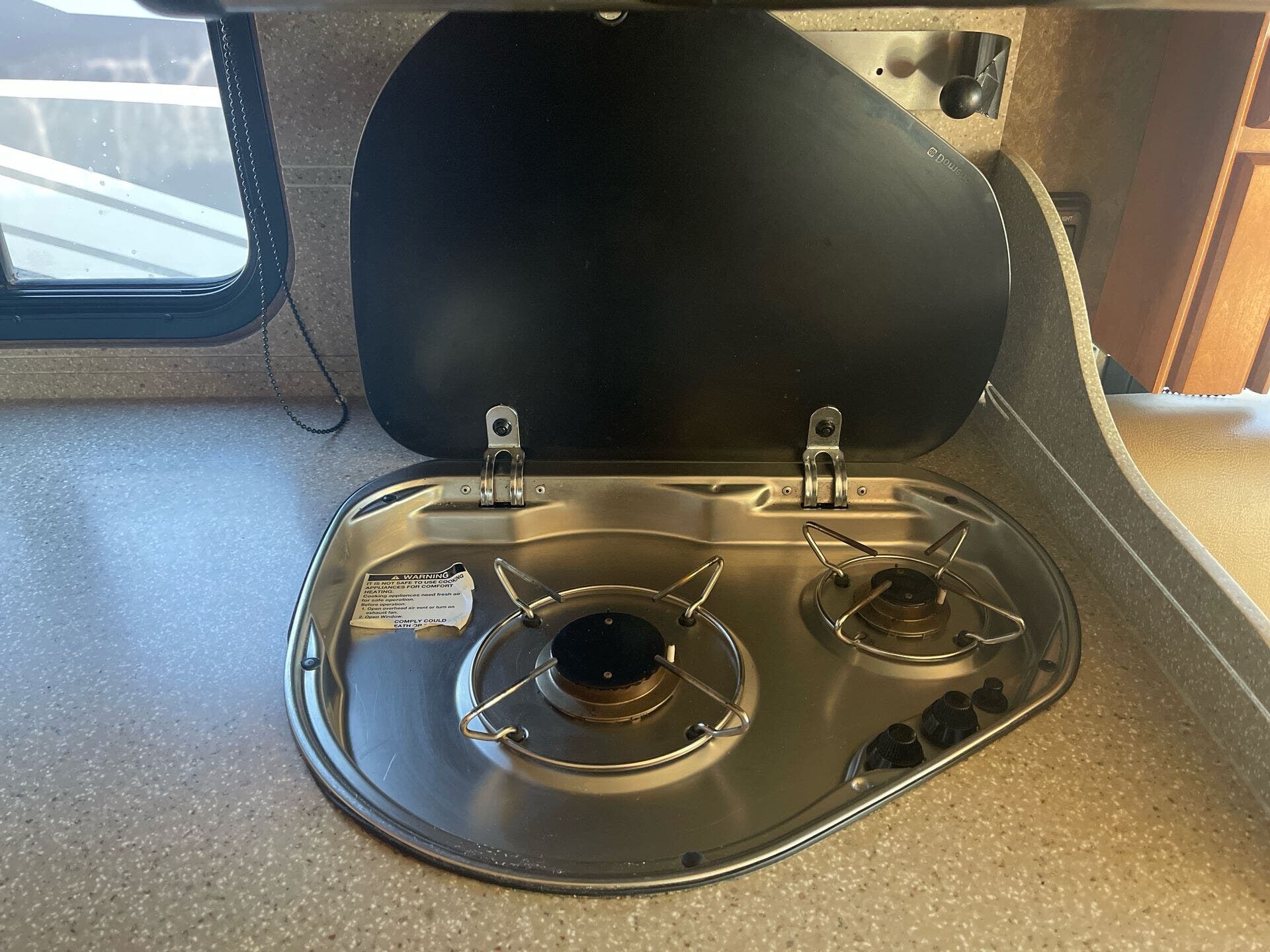 Inside, the coach sleeps between 5 and 6, depending on configuration. The floor plan features a rear queen bedroom with dual side wardrobes and storage, a split bath (toilet/vanity on one side, shower opposite), and an open living area up front. Opposing slide-outs accommodate a U-shaped dinette that converts to bed plus a sofa bed, and a well-equipped kitchen with a double-bowl sink, microwave, cooktop, refrigerator, and pantry.