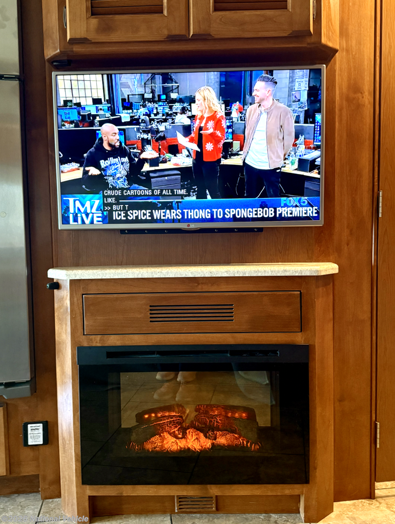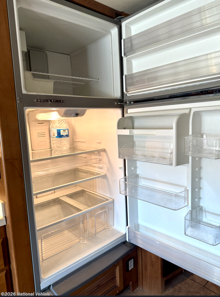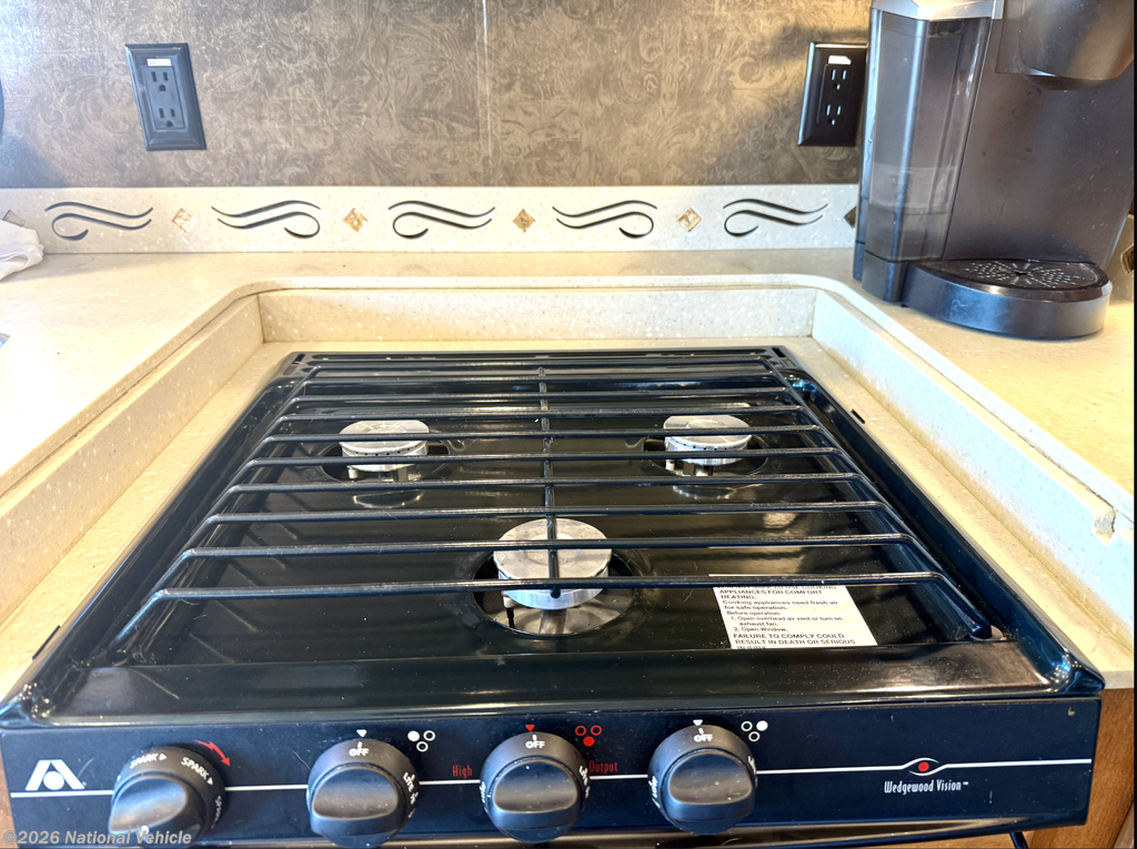Step inside to a warm, inviting living space featuring dual slide-outs that expand the interior for maximum comfort. The lounge area includes a sofa and dinette, large windows for natural light, and an entertainment center perfect for relaxing after a day of exploring. The fully equipped kitchen offers solid-surface countertops, a residential microwave, three-burner cooktop, refrigerator, and ample cabinetry?providing everything you need for cooking on the road.