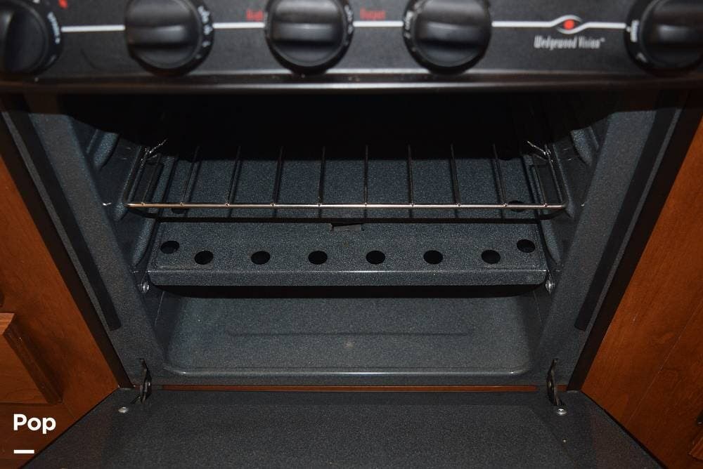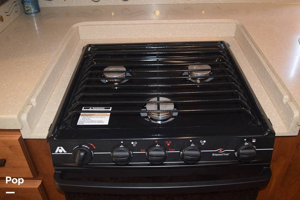 The kitchen is spacious with solid surface countertops, a 3-burner stove, oven, microwave, refrigerator/freezer, and a double sink