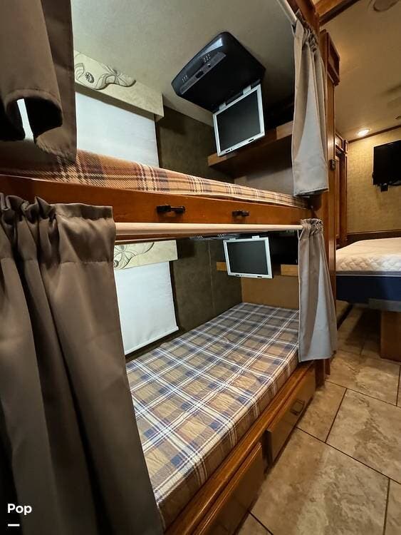 The master bedroom features a cozy queen-sized bed and ample storage. The bunkhouse at the rear of the RV is perfect for the kids or overnight guests, with its own TV and DVD player to keep everyone entertained.