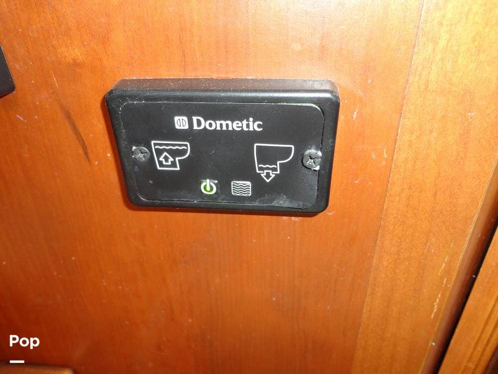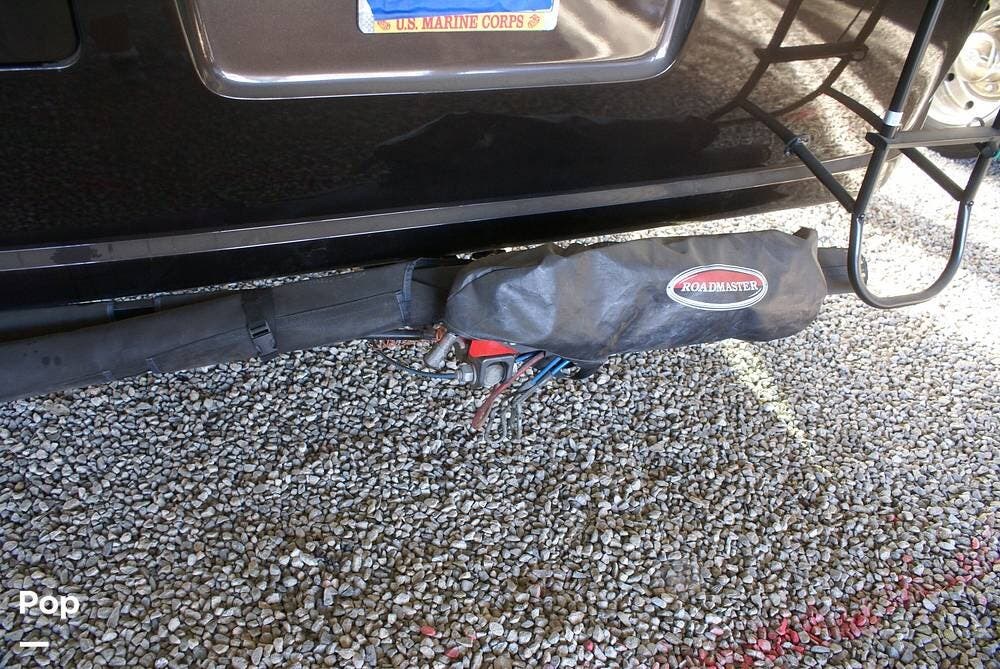 There are hydraulic levelers, a four-door refrigerator, a macerator toilet, a hitch, and a tow bar.