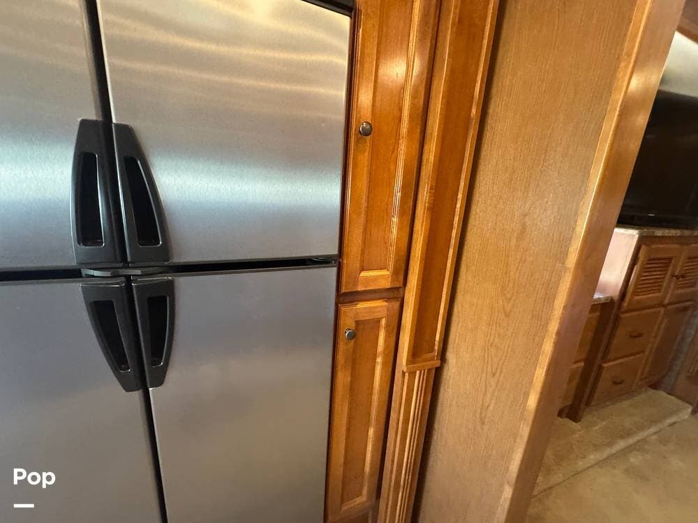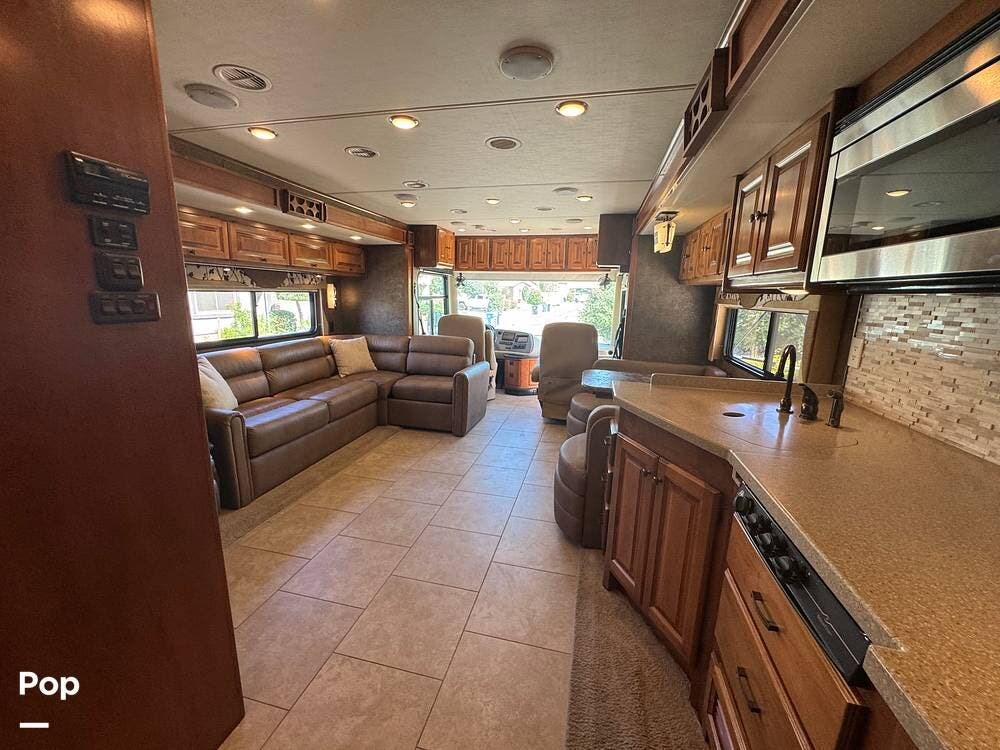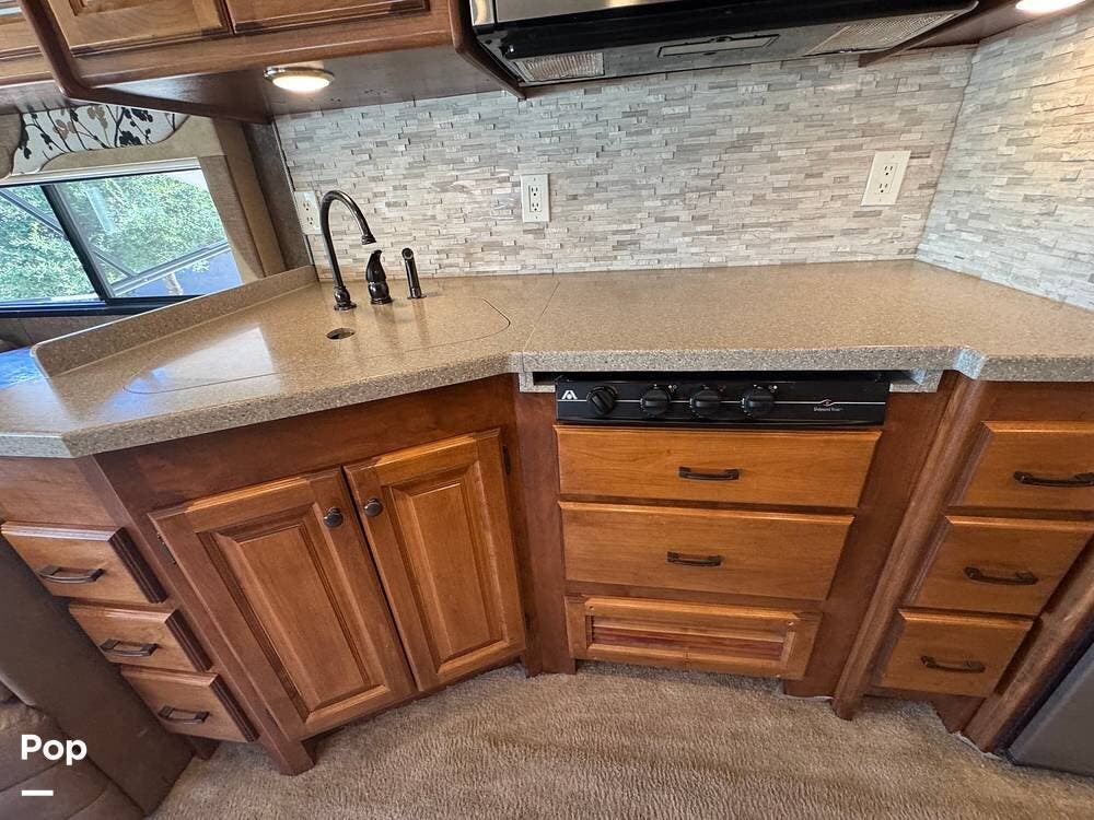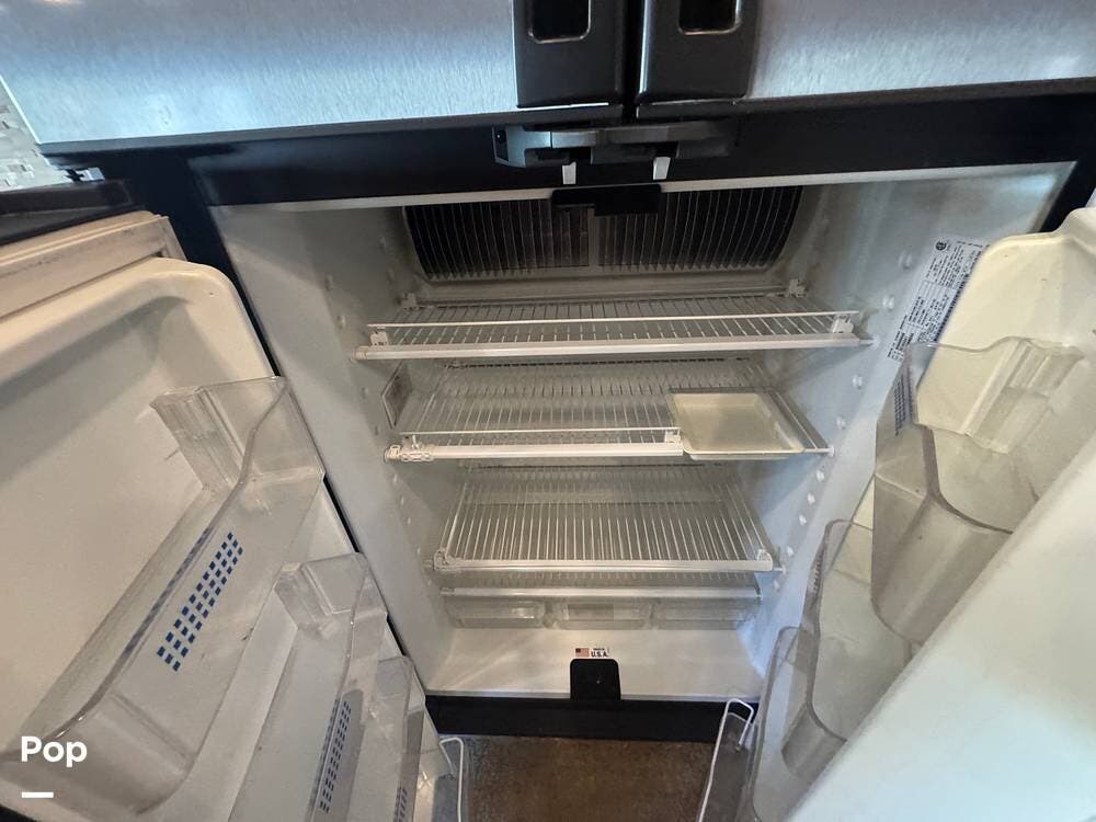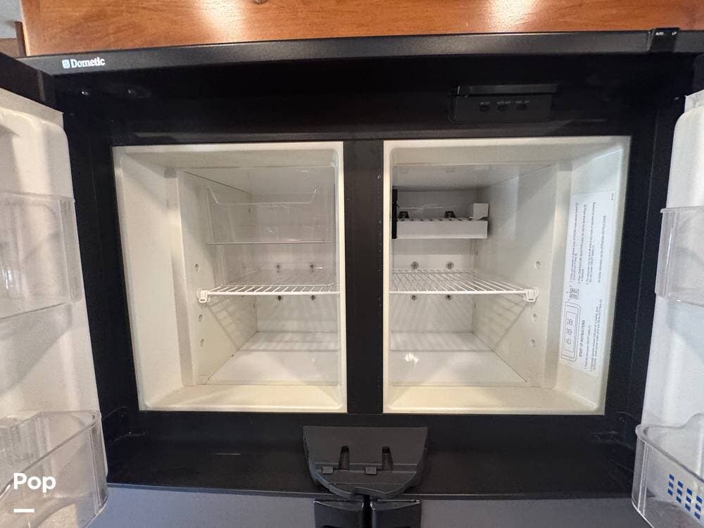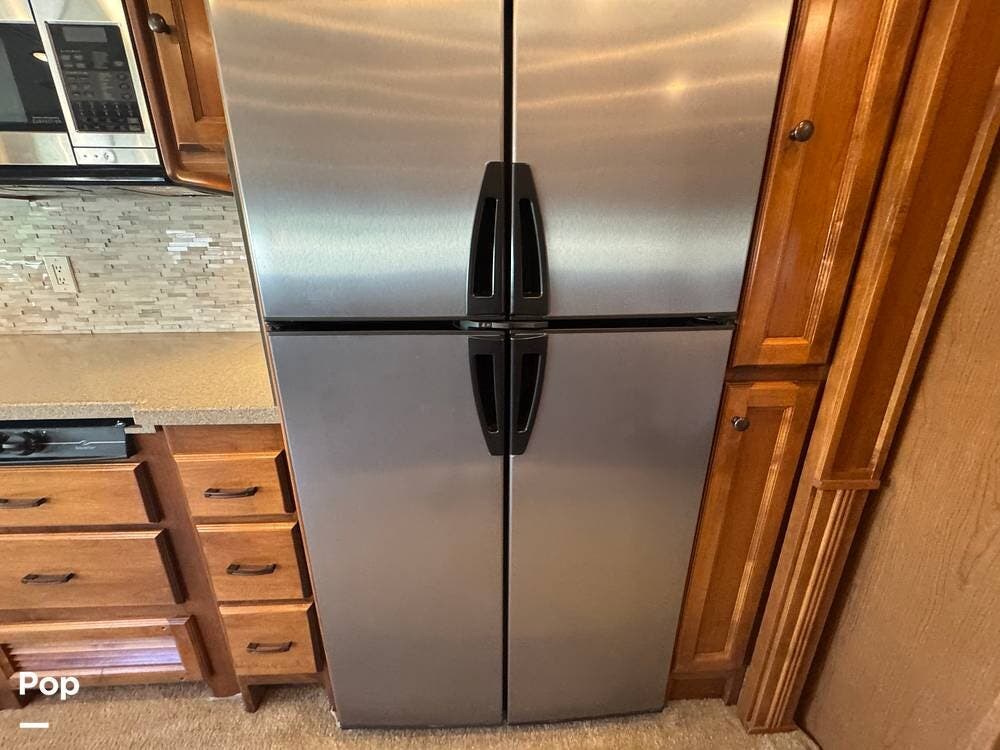 The front living area is designed for both relaxation and entertainment. Swiveling captain's chairs integrate into the living space, while a sofa sleeper, entertainment center, and optional fireplace provide a comfortable gathering area. The kitchen sits mid-coach and features a full-size refrigerator, solid-surface countertops, and a three-burner cooktop, making it well-suited for extended trips or full-time living.