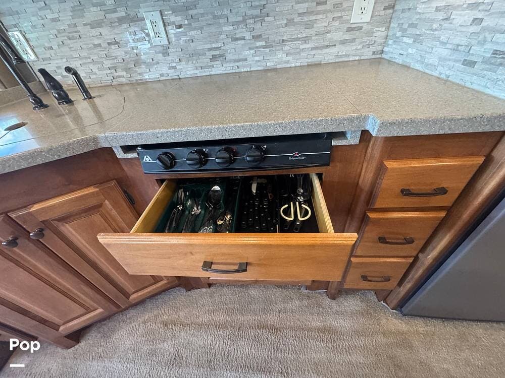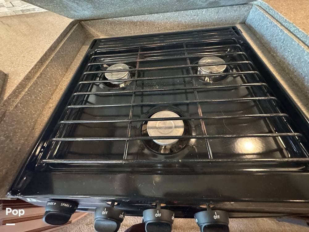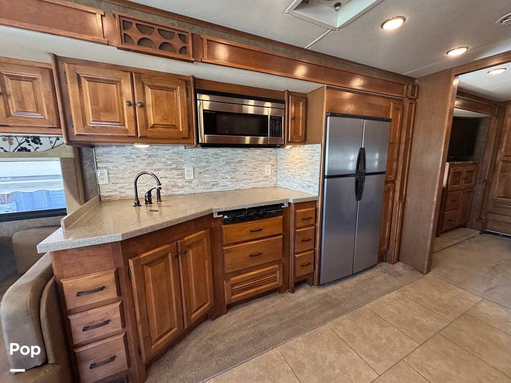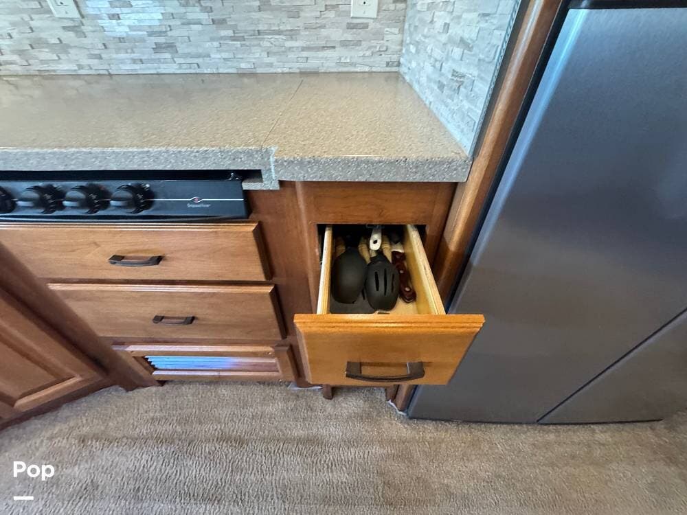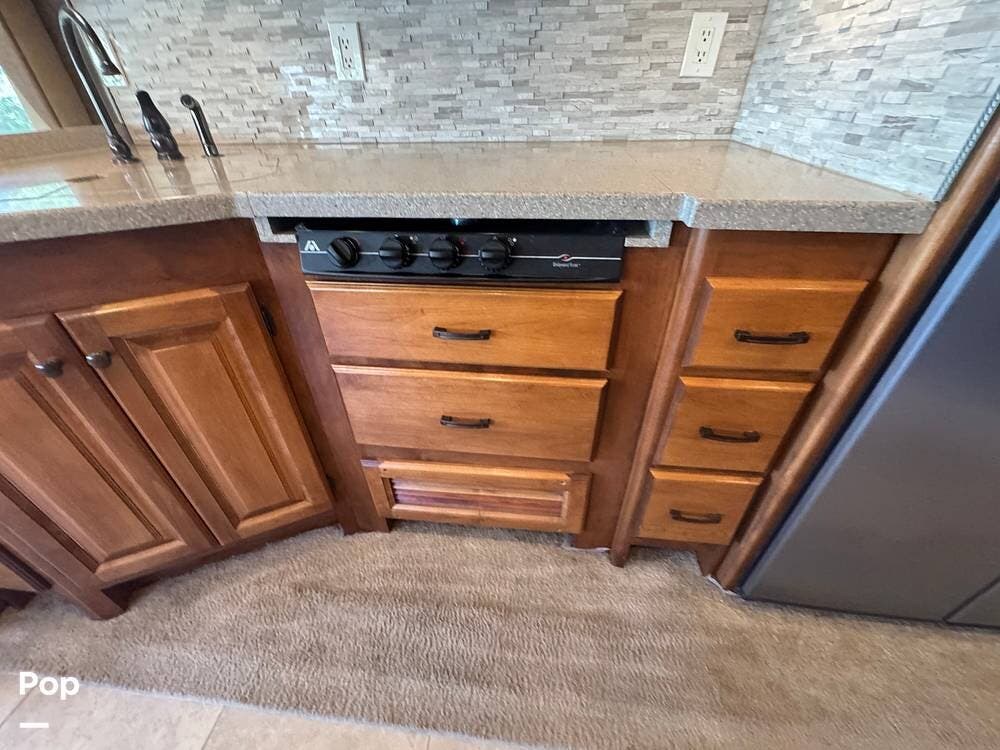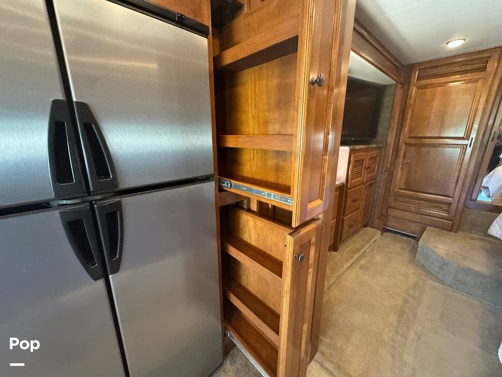 The front living area is designed for both relaxation and entertainment. Swiveling captain's chairs integrate into the living space, while a sofa sleeper, entertainment center, and optional fireplace provide a comfortable gathering area. The kitchen sits mid-coach and features a full-size refrigerator, solid-surface countertops, and a three-burner cooktop, making it well-suited for extended trips or full-time living.