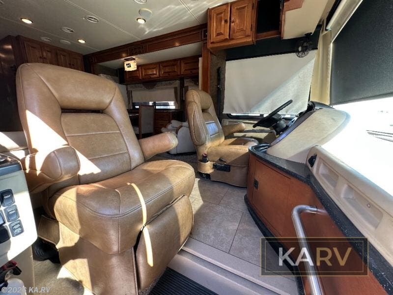 As you enter at the front passenger's side, there are two rotatable captain's chairs, overhead cabinets all around the cab area and an optional center TV.