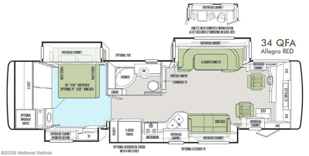 With features like automatic leveling, power awnings, abundant basement storage, and meticulous craftsmanship throughout, this Allegro Red 34QFA is designed for those who demand comfort without compromise.