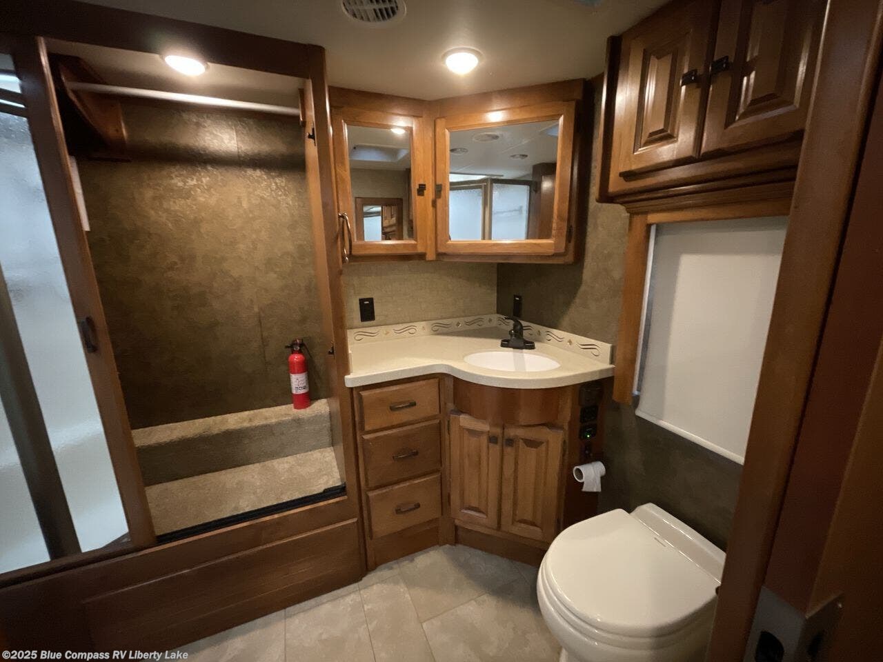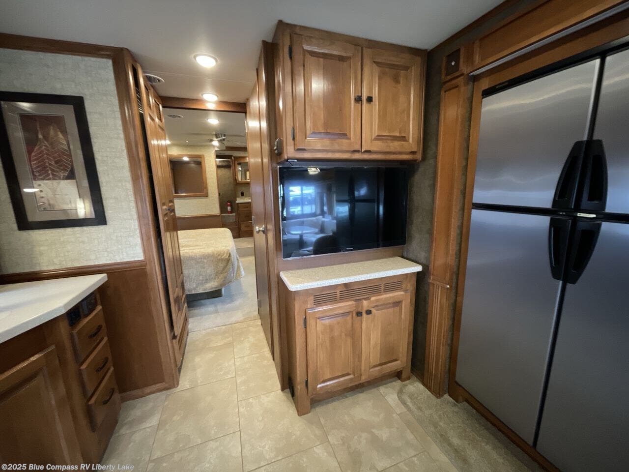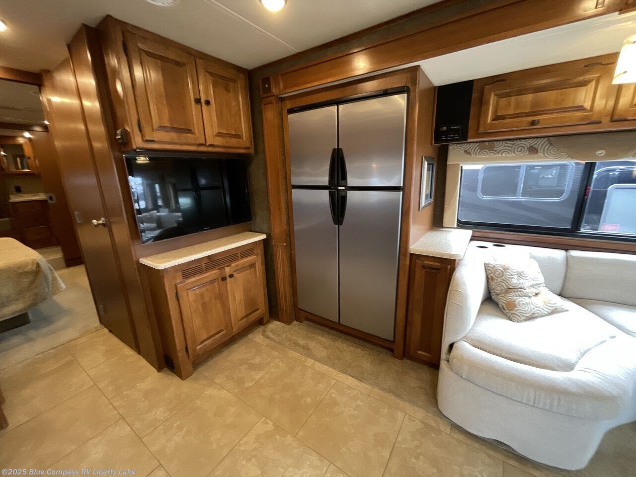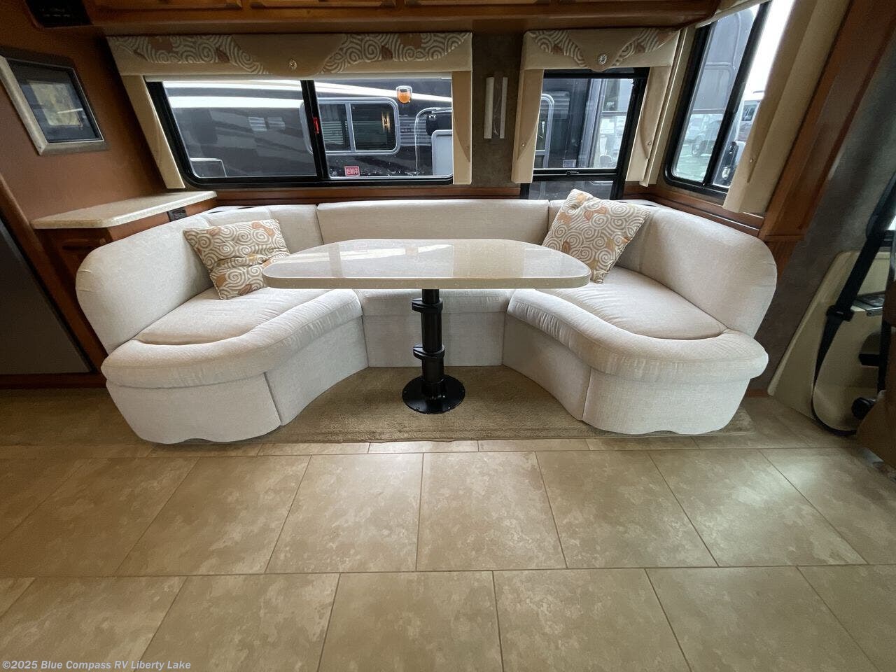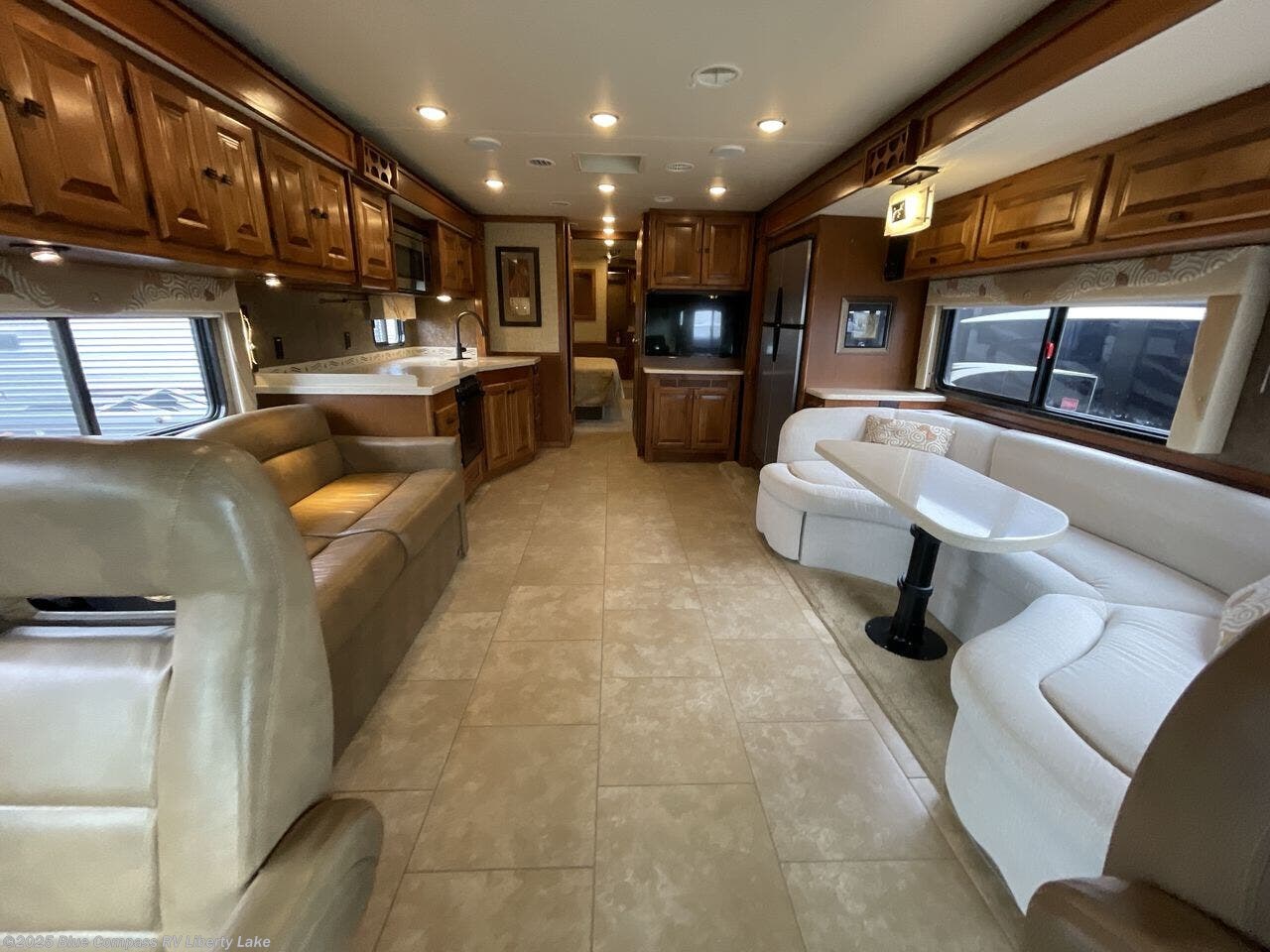 The road side provides a slide out with a generous u-shaped dinette, overhead cabinets, a partial pantry, a 2-door refrigerator and another full pantry. You may choose to have the slide include a lounge chair, dinette with computer workstation, overhead cabinets, refrigerator and pantry. You may also choose an optional 4-door residential refrigerator with 4 batteries. A standard TV faces the front of the coach and is on an interior wall.