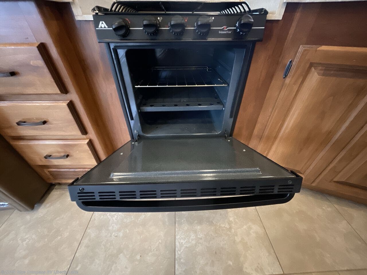 The curb side also provides a slide out housing a sofa, lots of overhead cabinets, a three burner range, overhead microwave, and angled kitchen sink. A closet for an optional washer/dryer is on the interior wall just beyond this slide.