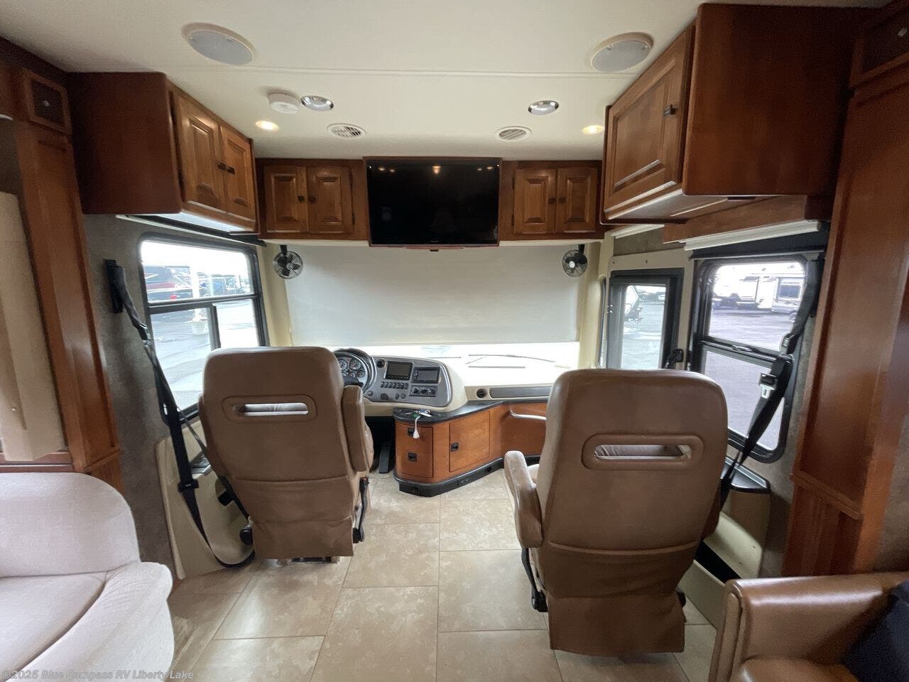 The front cab area holds two rotatable captain's chairs, overhead cabinets all around and an optional center TV.