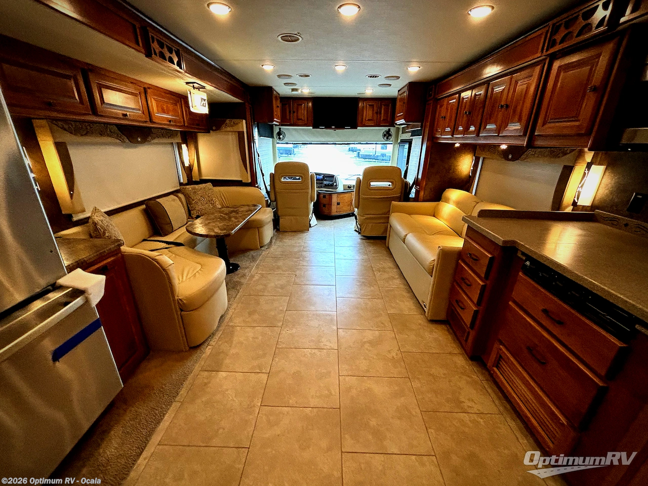 The front cab area holds two rotatable captain's chairs, overhead cabinets all around and an optional center TV.