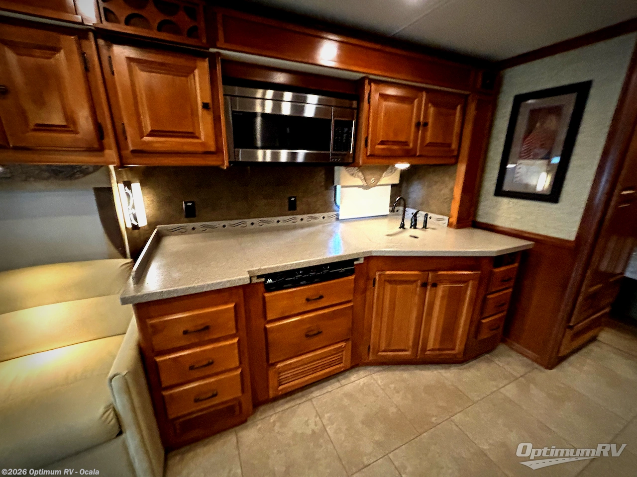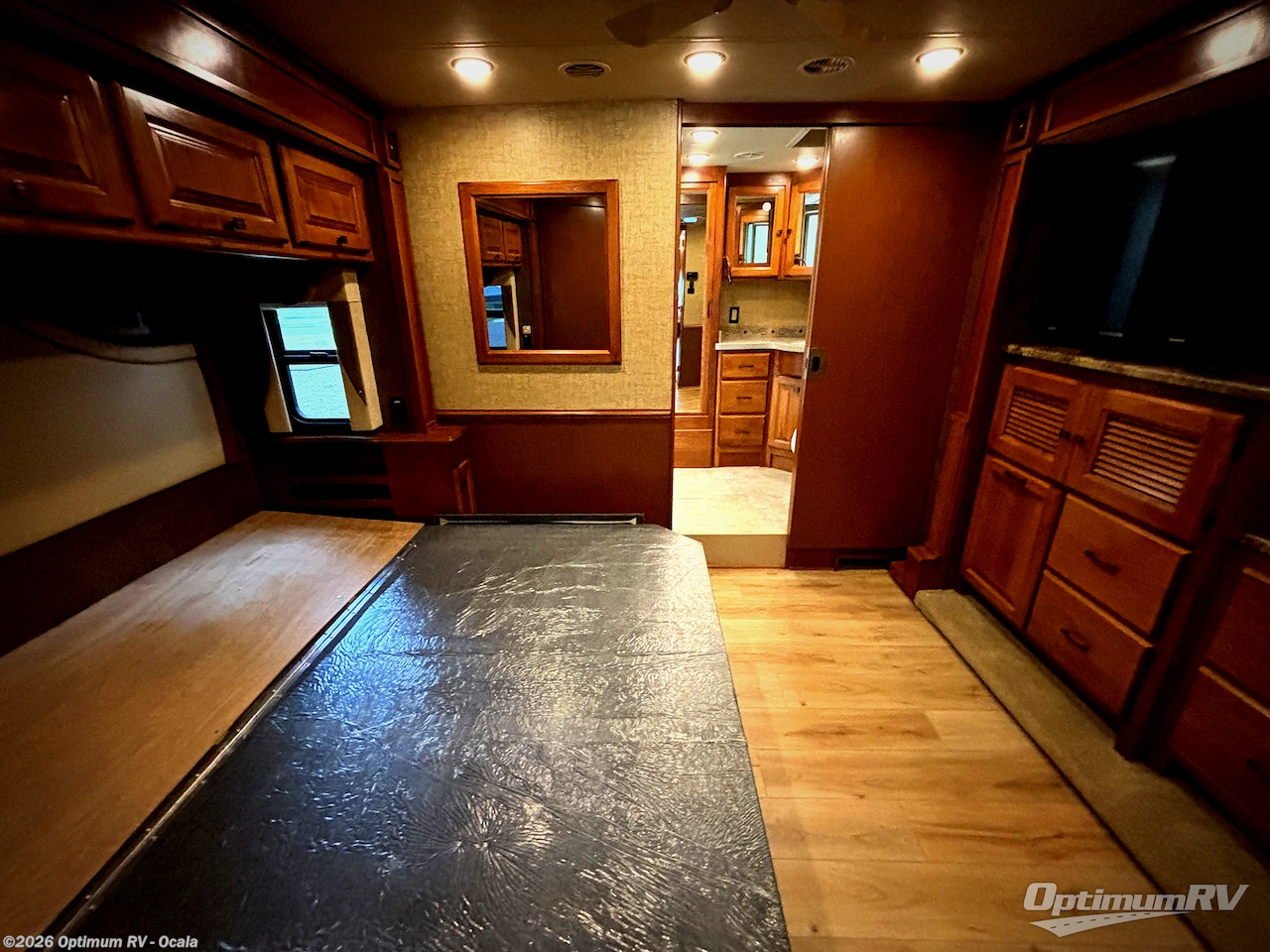 The road side provides a slide out with a sofa bed, booth dinette and overhead cabinets. You may choose a dinette with computer workstation in place of the booth dinette. A standard TV faces the front of the coach and is on an interior wall.
