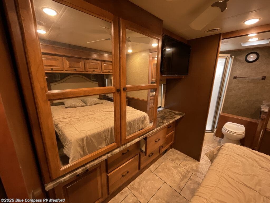 The private bedroom includes a queen bed slide with nightstands at each side and overhead cabinets. The wall opposite the bed includes a wardrobe with drawers below as well as a vanity with a TV and overhead cabinets above.