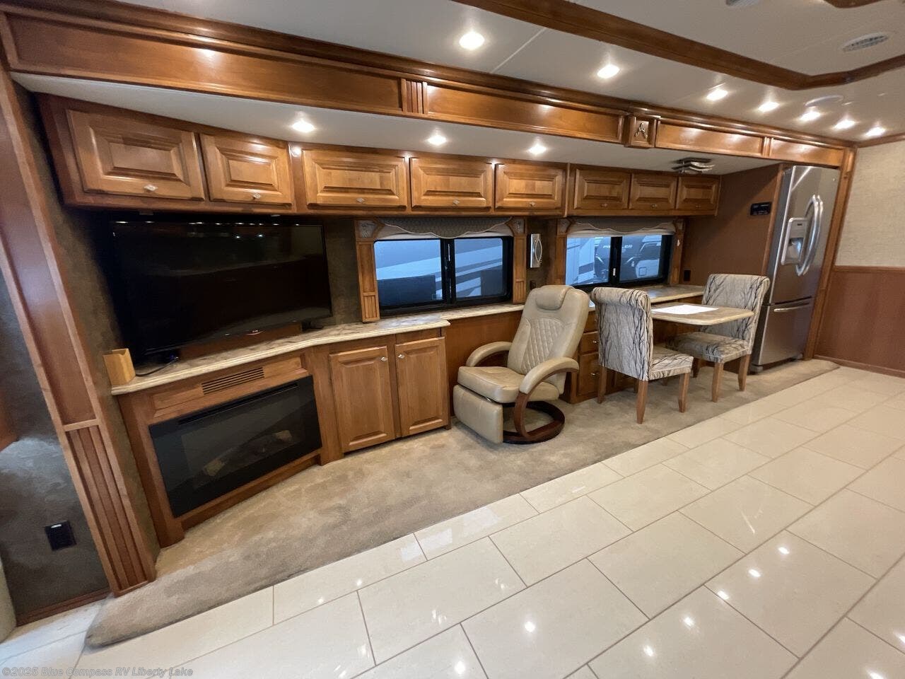 The opposite wall holds another slide, opening up the living area. It houses a residential refrigerator, a booth dinette, a sofa bed and a TV with an optional fireplace below. You may choose an optional 4-door gas/electric refrigerator with 4 batteries. You may also choose options for the furniture in this slide including a dinette with computer workstation, or a u-shaped dinette, or an entertainment center with one leather lift recliner and a flip table, or two leather lift recliners, or an entertainment center with two leather lift recliners.