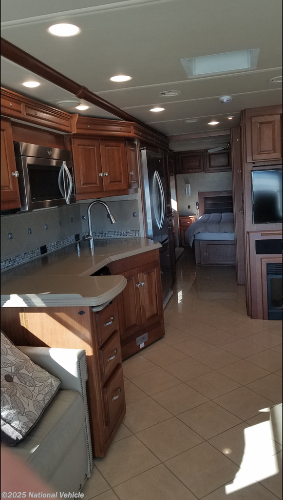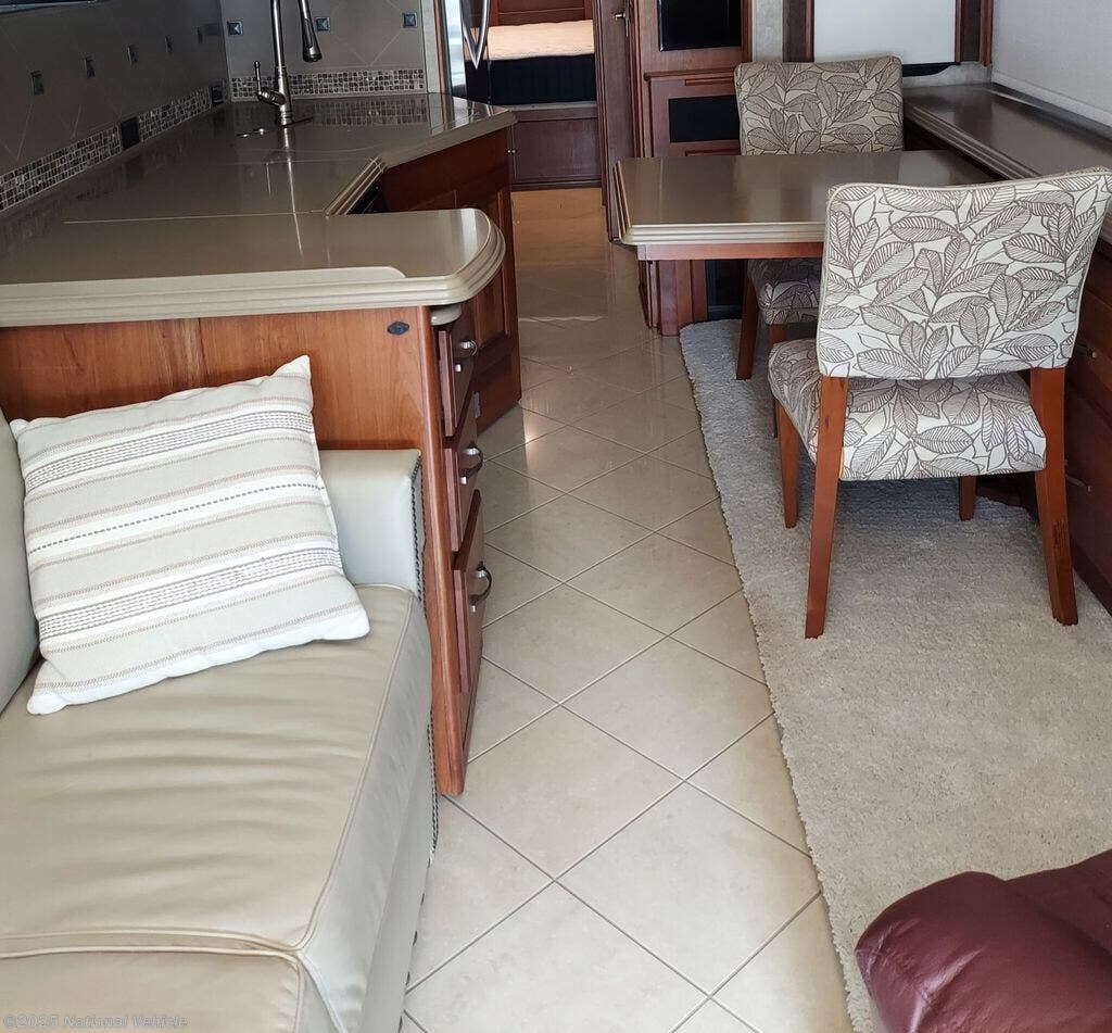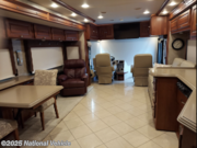 On the opposite side find a slide out rest easy sofa and Glide and Dine table and chairs with buffet. You can also chose an extendable sectional dinette instead. There is a 40" mid-coach TV nearby, with a fireplace below.