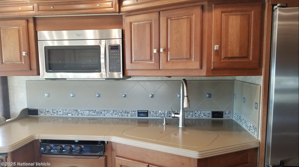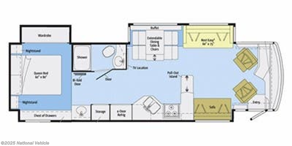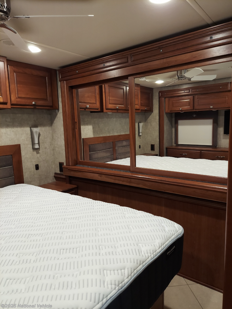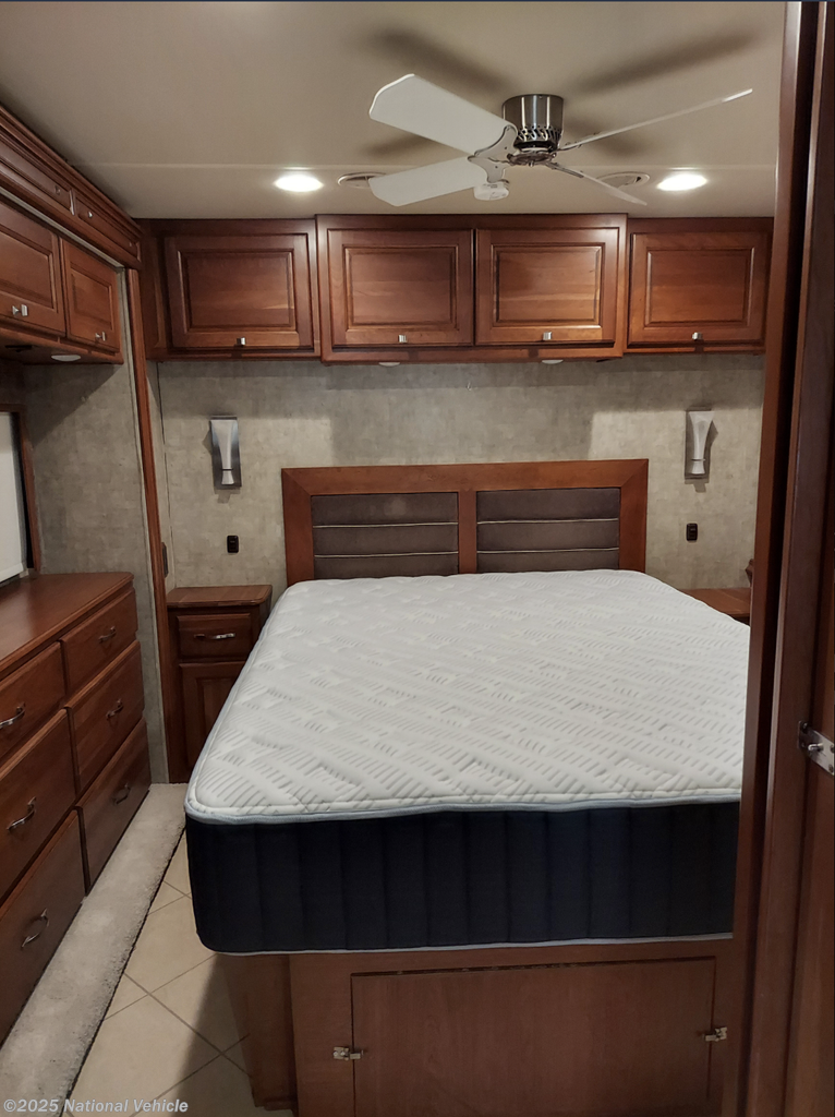 The rear bedroom features a single slide out wardrobe on the driver side, and the full wall slide finishes up on the passenger side with a chest of drawers and a 32" HDTV. There is a vanity sink in the bedroom that has hot water heated by the engine when traveling. You will also enjoy the queen size bed and dual nightstands, overhead storage, plus so much more!
