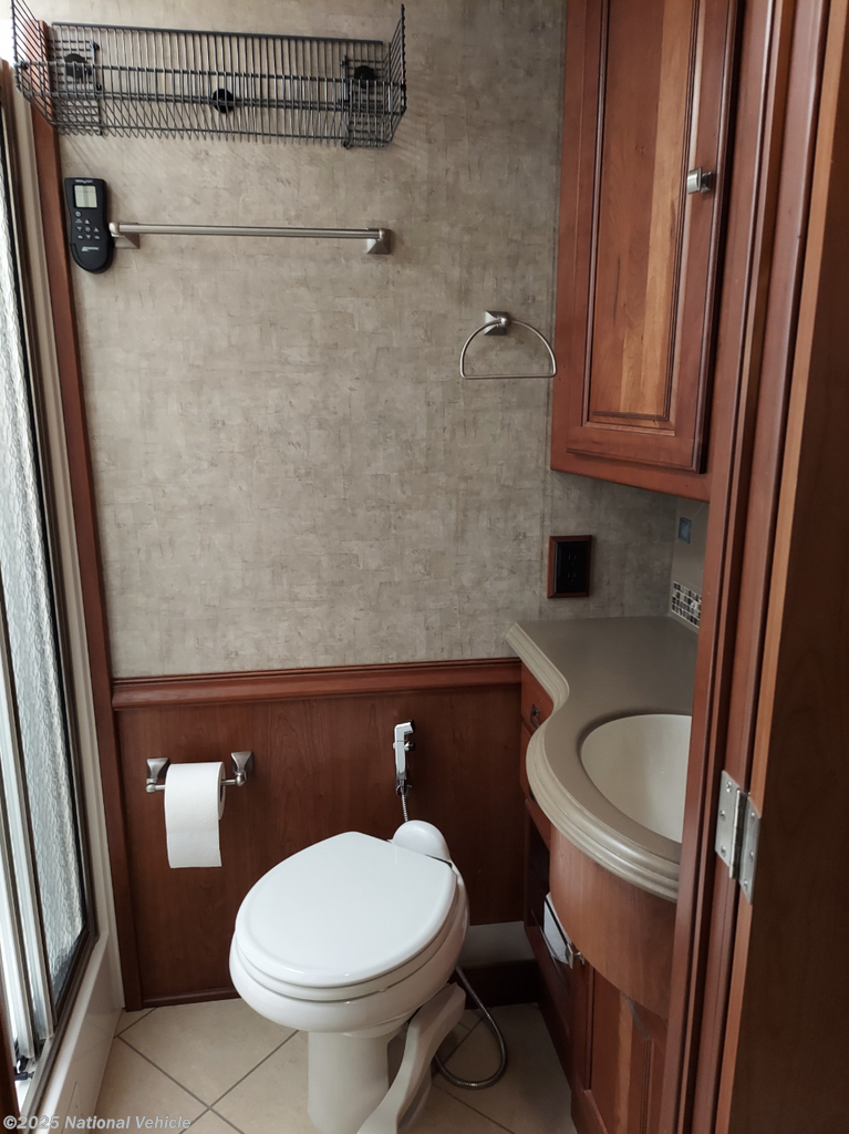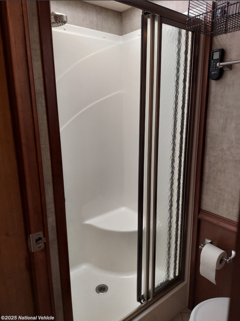 Next on the driver's side is a side aisle bath featuring a shower, toilet, and vanity with sink. Bi-fold doors are just outside the bath door so you can separate the rear bedroom from the front of the coach.