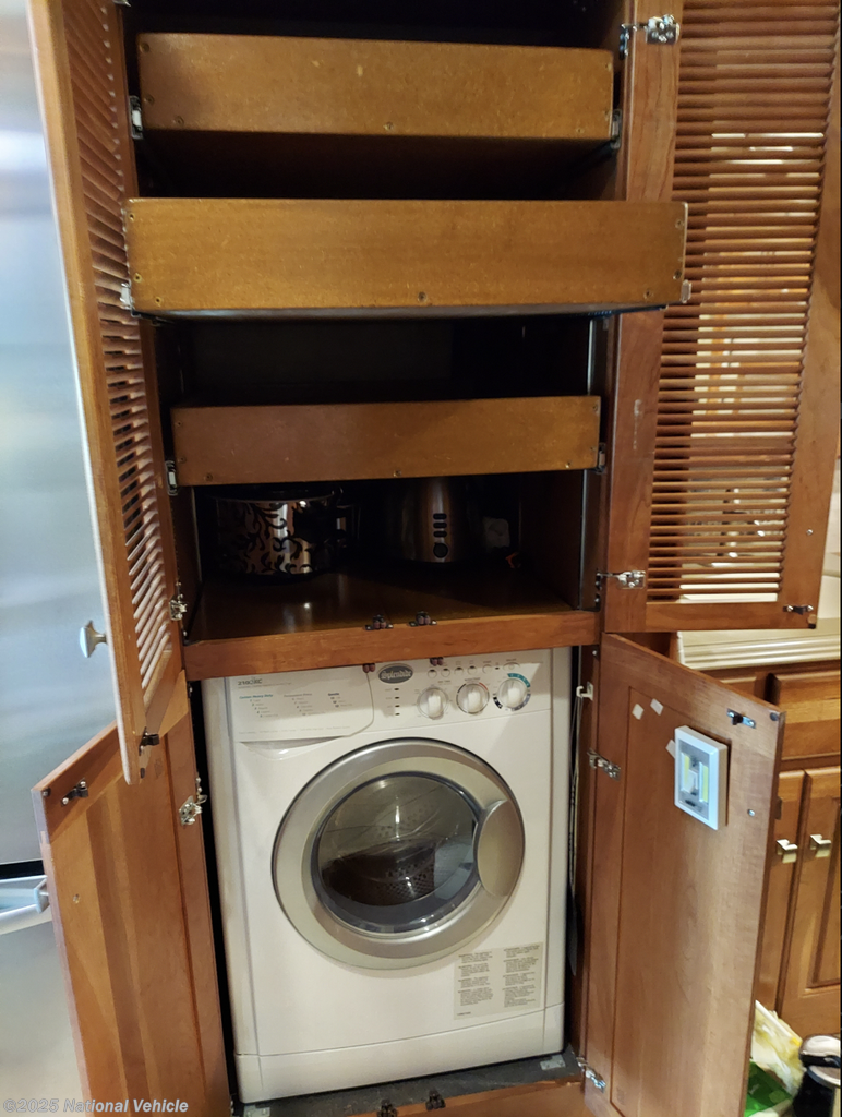 Next, find a counter top with pull-out island, a three burner range, microwave, double kitchen sink, and residential refrigerator, plus a washer and dryer unit.