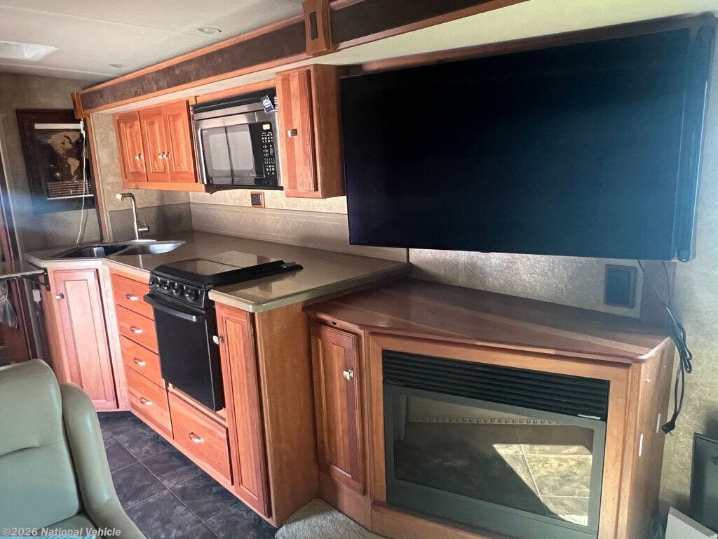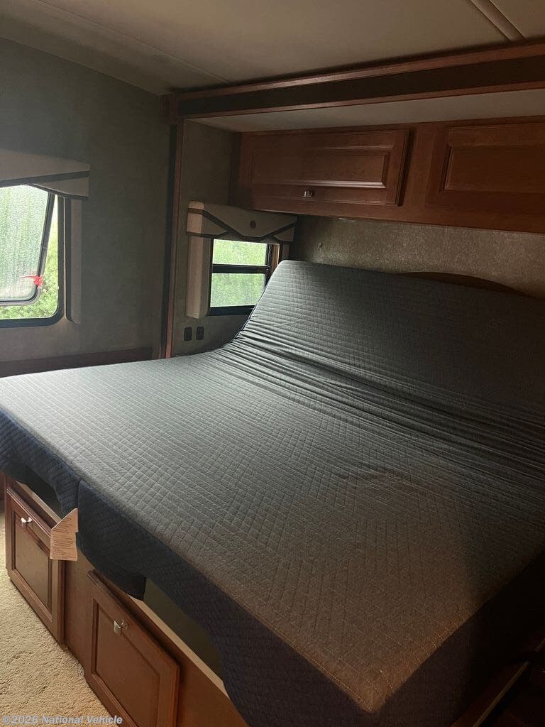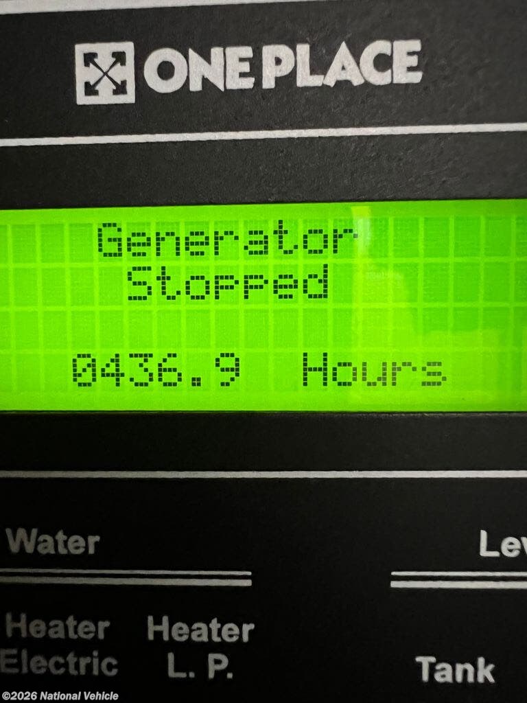 The RV is equipped with a GPS navigation system, a rearview camera, and Bluetooth connectivity for modern convenience.