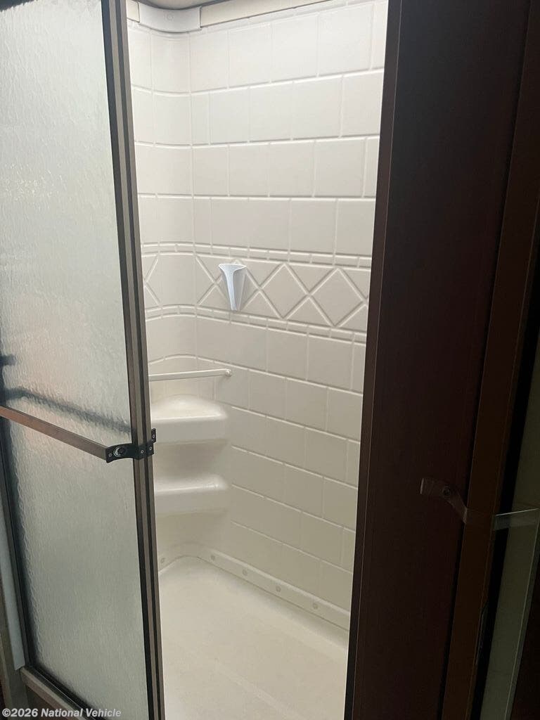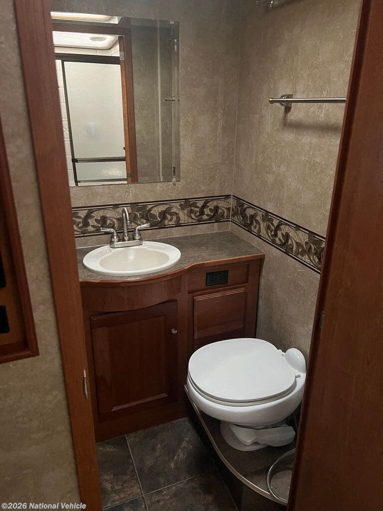 The Sightseer 35G offers a well-appointed bathroom with a spacious shower, a porcelain toilet, and a vanity with sink and storage.